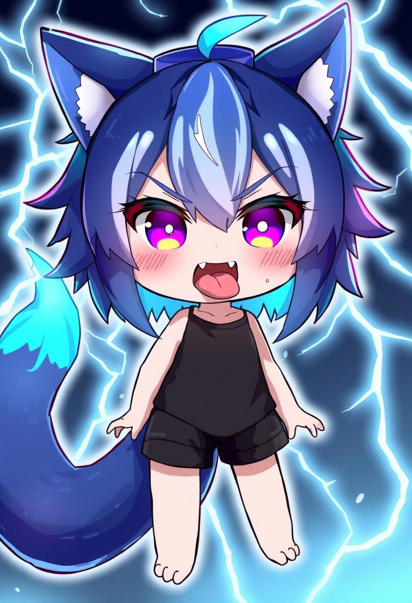 (masterpiece), (expressive eyes), (chibi), (raiju), gradient hair, glowing hair, dark blue hair to cyan hair, electricity, lightning, animal ears, tail, microshorts, crop top, drooling, saliva strands, tongue out, licking lips, (animal legs), (calfhigh fur:1.2), full body, close up,