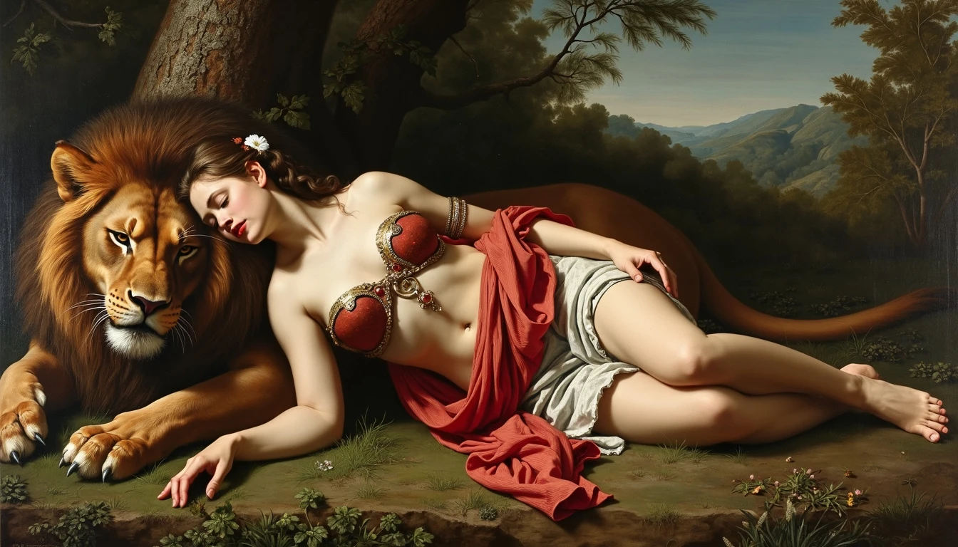 Classical 17th century oil painting style, Painting of a Greek goddess of incomparable sensuality and beauty lying with her head resting on the torso of a fierce lion lying under a tree. The goddess is lying dressed up with a traditional Medieval women's clothing. Her head is hyperextended backwards, her eyes closed, her voluptuous lips half-open. She has one hand behind her neck intertwined with her long hair. The other hand rests between her legs