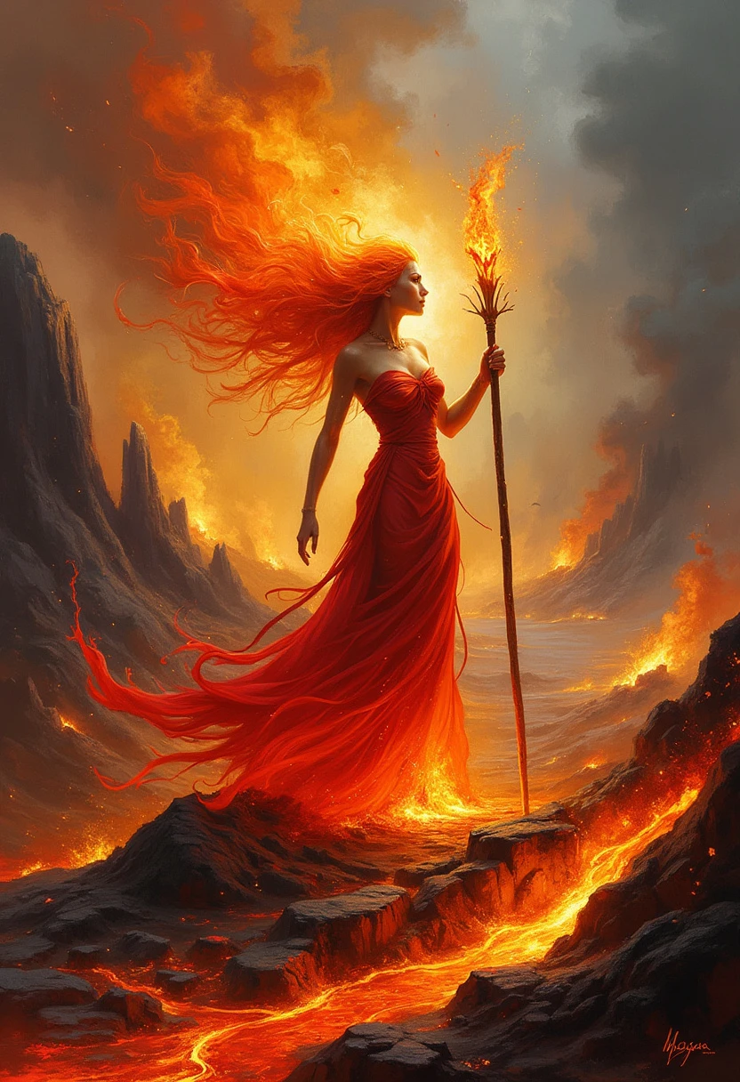 Oil painting of a powerful fire goddess in a volcanic landscape A fierce fire goddess standing amidst erupting volcanoes, her fiery red and gold hair flowing like molten lava. Her glowing skin radiates intense heat, and her gown is made of swirling flames. The volcanic landscape around her is filled with rivers of lava and ash clouds rising into a dark, smoke-filled sky. She holds a blazing staff, with embers dancing around her. The painting features rich, bold brushstrokes, emphasizing the intensity of the heat and flames. The mood is dynamic and intense, showcasing her raw power and elemental control.