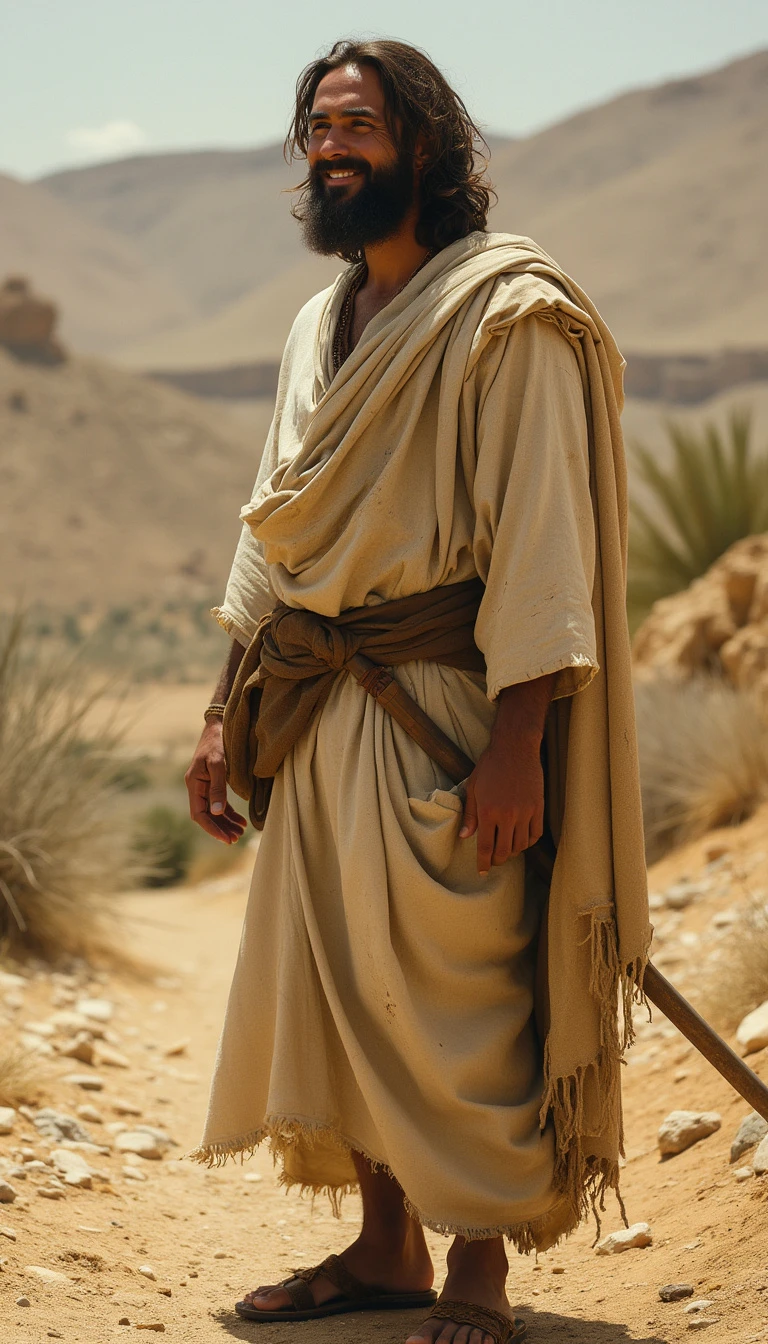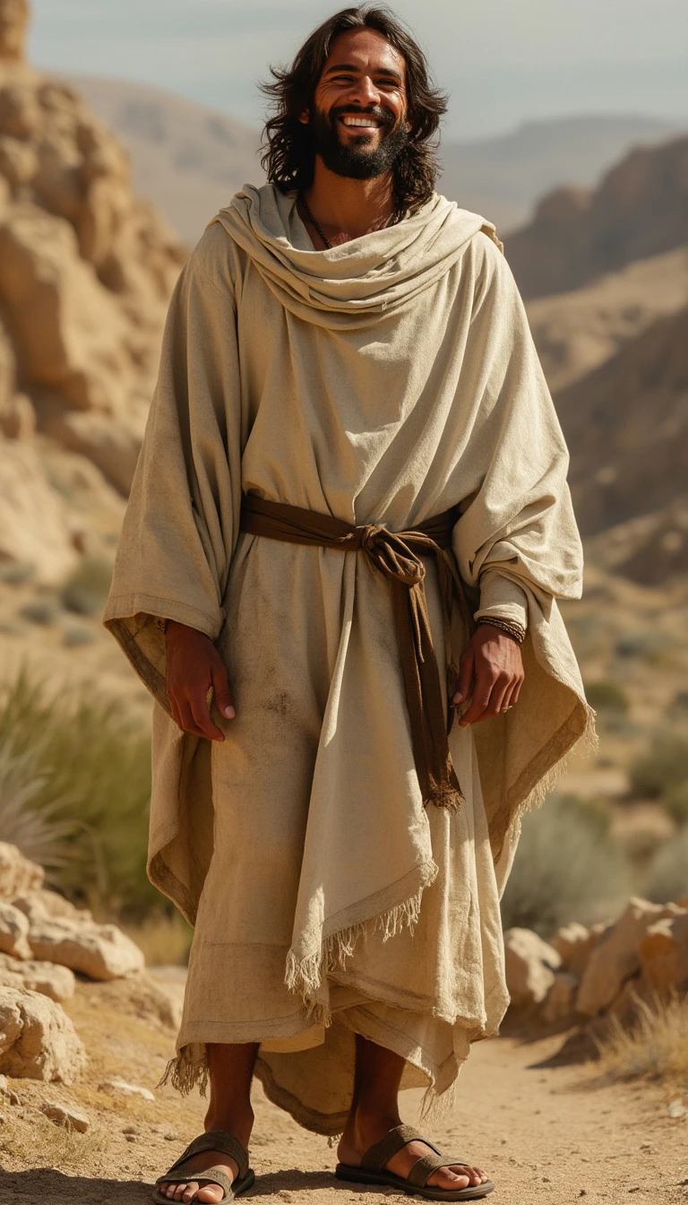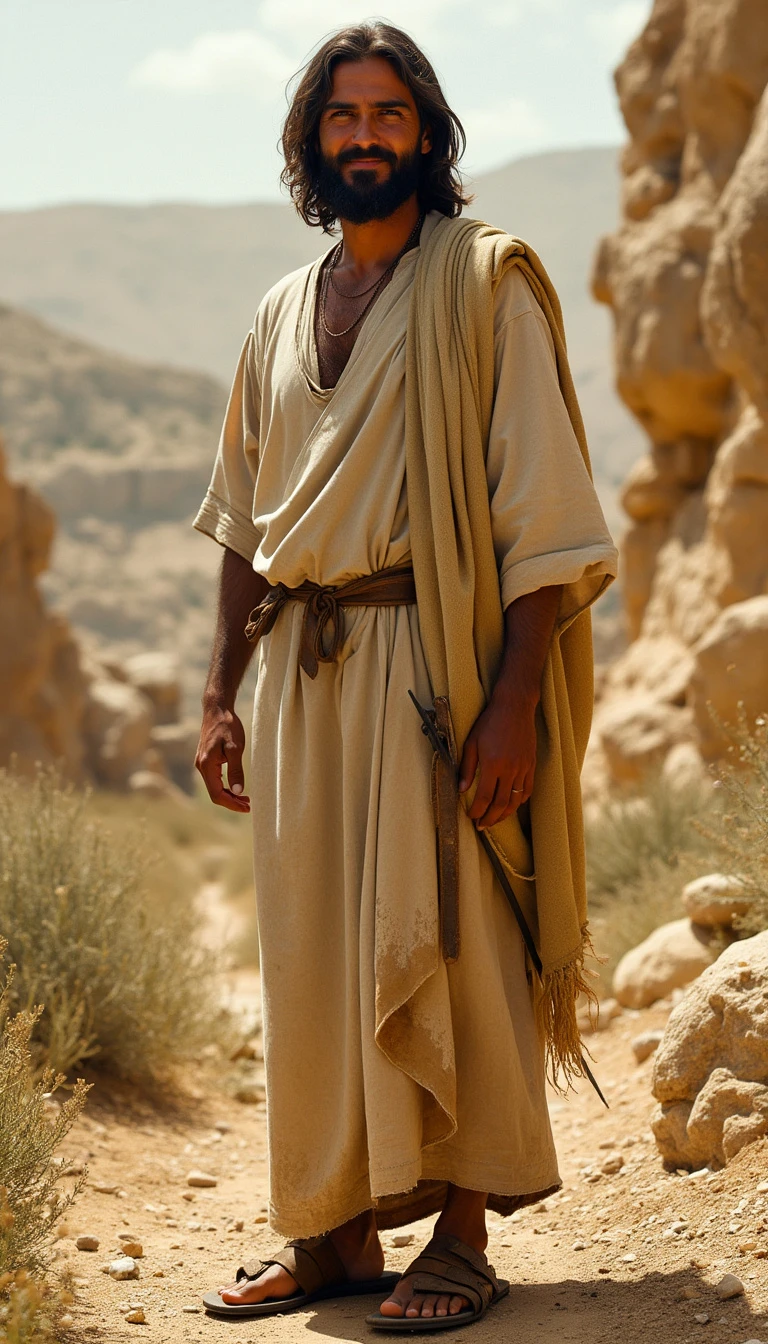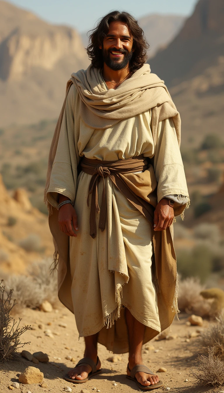 Jesus with an inviting smile. Expressing his love and warmth. His face is slightly tanned with the color of ripe corn. He displays seriousness, wisdom, gentleness and kindness with no signs of anger. He is of great beauty and remarkable stature. Standing about 6 feet tall, with perfect physical proportions. His forehead is broad and straight, a straight nose and large slightly prominent cheeks.Depict a full-body image of Jesus standing in a typical environment from ancient times. He is wearing simple, humble clothing made from coarse, natural fabrics like wool or linen. His robe is slightly worn, with frayed edges, and the color is an earthy, off-white or light beige, weathered from years of use. The loose-fitting cloak drapes over his shoulders, tied at the waist with a simple belt. His sandals are made of basic leather straps. He stands in a dry, rocky landscape typical of the Judean countryside, with hills and sparse vegetation in the background, under a warm, gentle light. The scene evokes serenity, with Jesus standing peacefully, reflecting his connection with the everyday life of common people in that ancient time.”