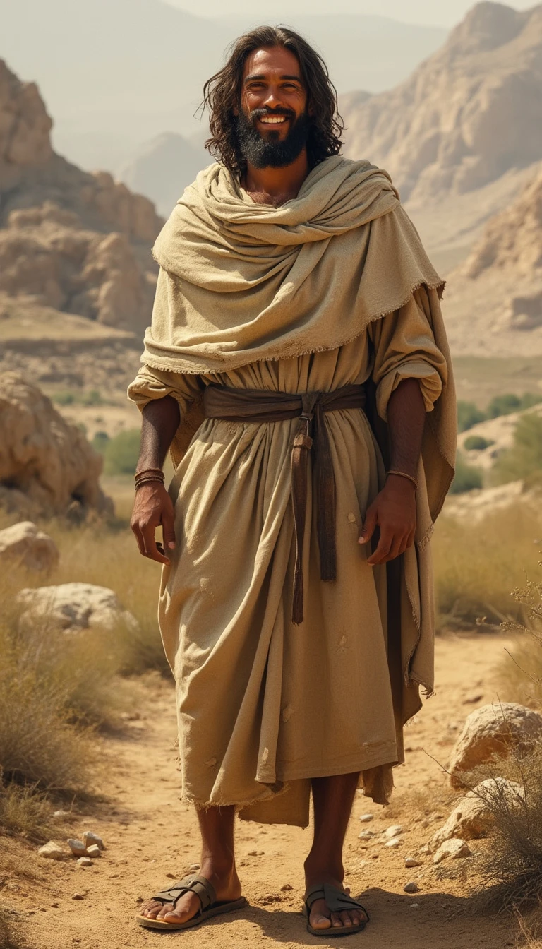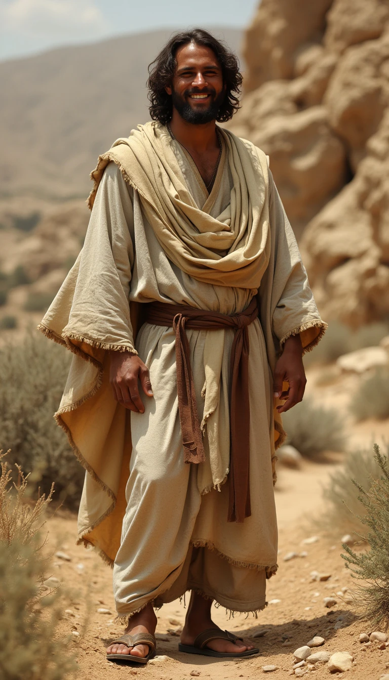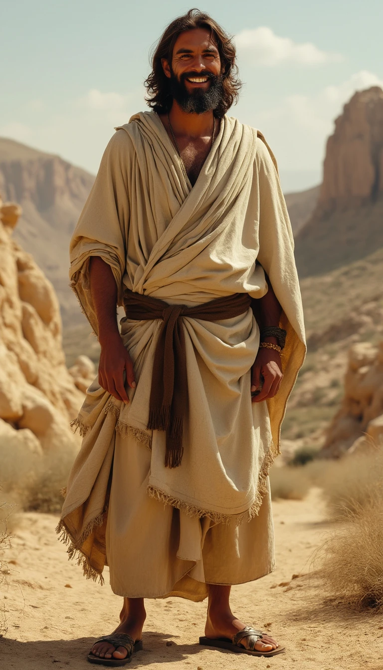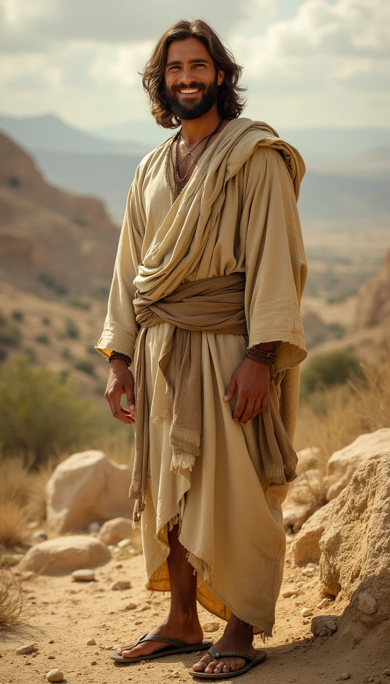 man with an inviting smile. Expressing his love and warmth. His face is slightly tanned with the color of ripe corn. He displays seriousness, wisdom, gentleness and kindness with no signs of anger. He is of great beauty and remarkable stature. Standing about 6 feet tall, with perfect physical proportions. His forehead is broad and straight, a straight nose and large slightly prominent cheeks.Depict a full-body image of a man standing in a typical environment from ancient times. He is wearing simple, humble clothing made from coarse, natural fabrics like wool or linen. His robe is slightly worn, with frayed edges, and the color is an earthy, off-white or light beige, weathered from years of use. The loose-fitting cloak drapes over his shoulders, tied at the waist with a simple belt. His sandals are made of basic leather straps. He stands in a dry, rocky landscape typical of the Judean countryside, with hills and sparse vegetation in the background, under a warm, gentle light. The scene evokes serenity, with Jesus standing peacefully, reflecting his connection with the everyday life of common people in that ancient time.”