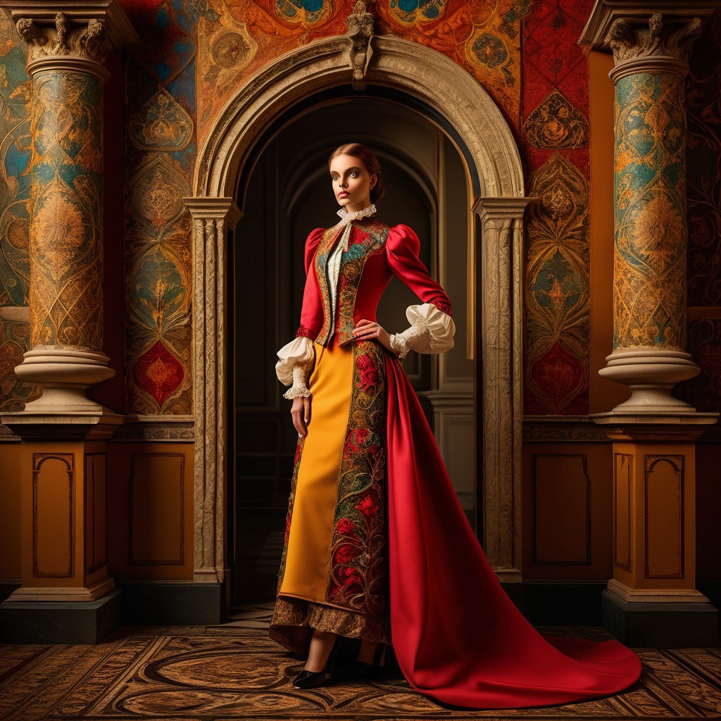 An elegant fashion model posing in a fusion of Renaissance and modern attire, blending intricate historical elements with contemporary bold colors, vibrant hues contrasted against a sepia-toned Renaissance backdrop, highlighting iconic architectural, full-body view