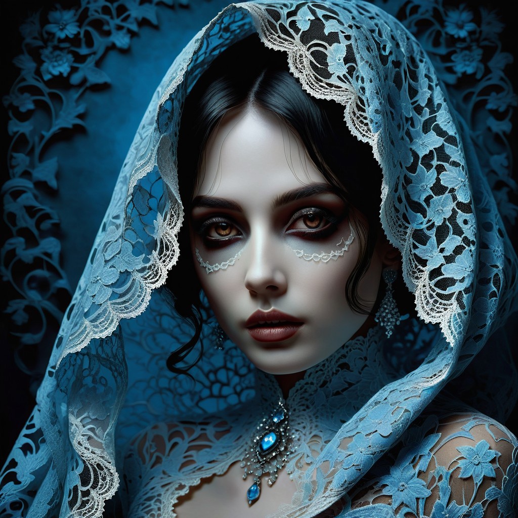 A high-contrast black and white portrait of a mysterious woman< (brown eyes), (black hair). She is draped in intricate lace, with a dark, flowing veil partially covering her face. The light blue lace is detailed, with floral patterns that frame her face elegantly. Her lips are full and painted in a deep, matte shade, adding to the gothic aesthetic. The overall mood is dark and enigmatic, with a focus on the sharp contrasts, delicate textures of the lace, and the piercing gaze of the woman, creating a hauntingly beautiful and timeless image.