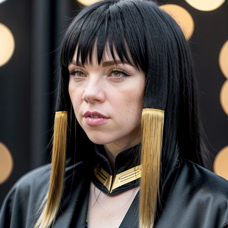 close-up photo of C4rlyR43J3ps3n_V2-Emb , makeup, wearing black robes with gold trim,inside palace of black marble and gold trim, 8k uhd, high quality, dramatic, bokeh, hyper realistic , lifelike texture, ((very long hair)), cropped bangs, black hair, ((flat bangs)), bangs cover forehead