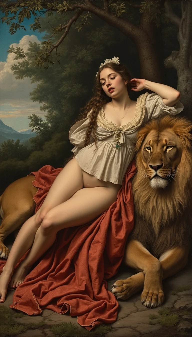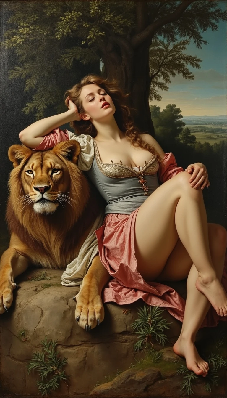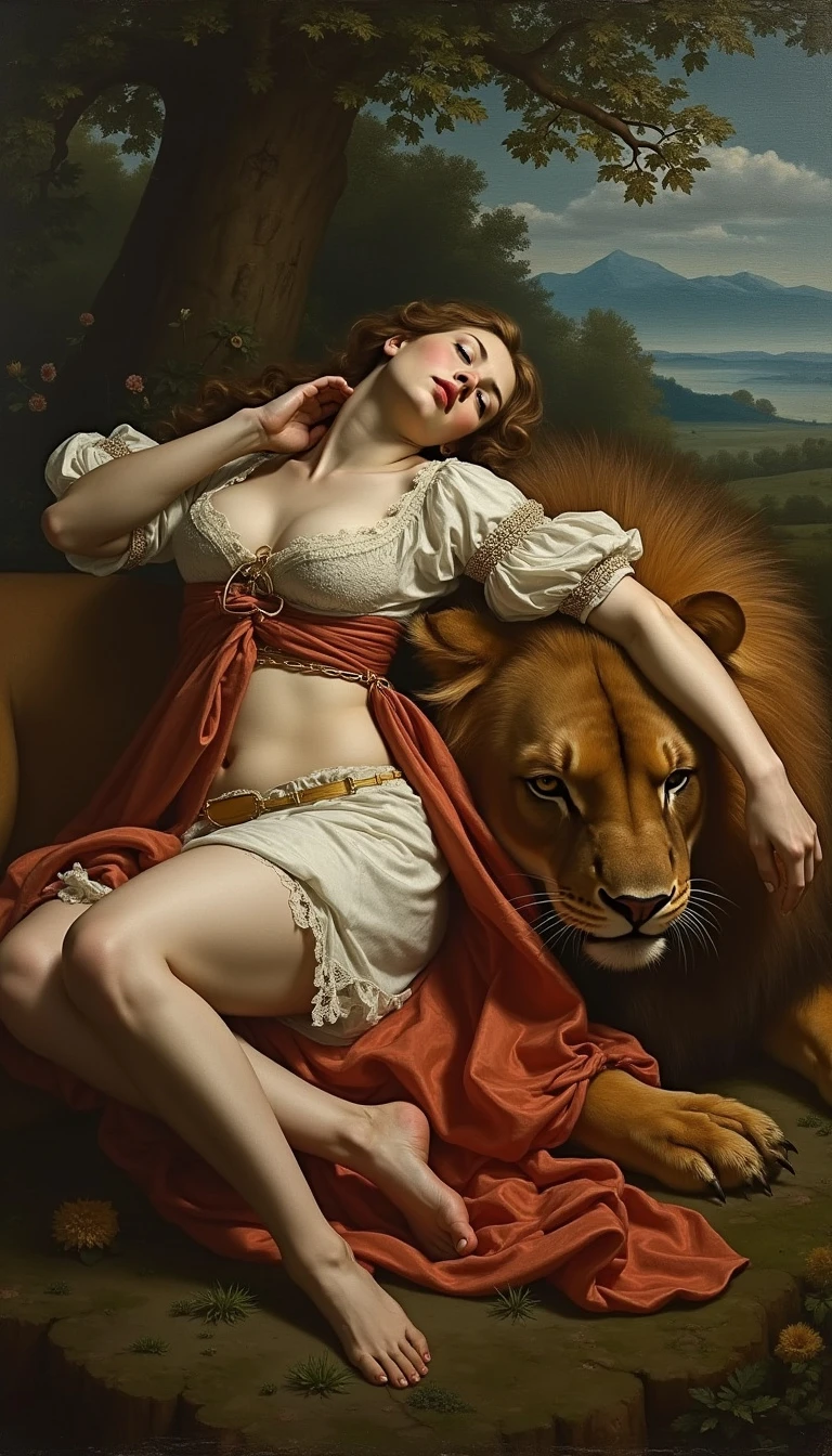 Classical 17th century oil painting style, Painting of a woman of incomparable sensuality and beauty lying with her head resting on the torso of a fierce lion lying under a tree. The woman is lying dressed up with a traditional Medieval women's clothing. Her head is hyperextended backwards, her eyes closed, her voluptuous lips half-open. She has one hand behind her neck intertwined with her long hair. The other hand rests between her legs