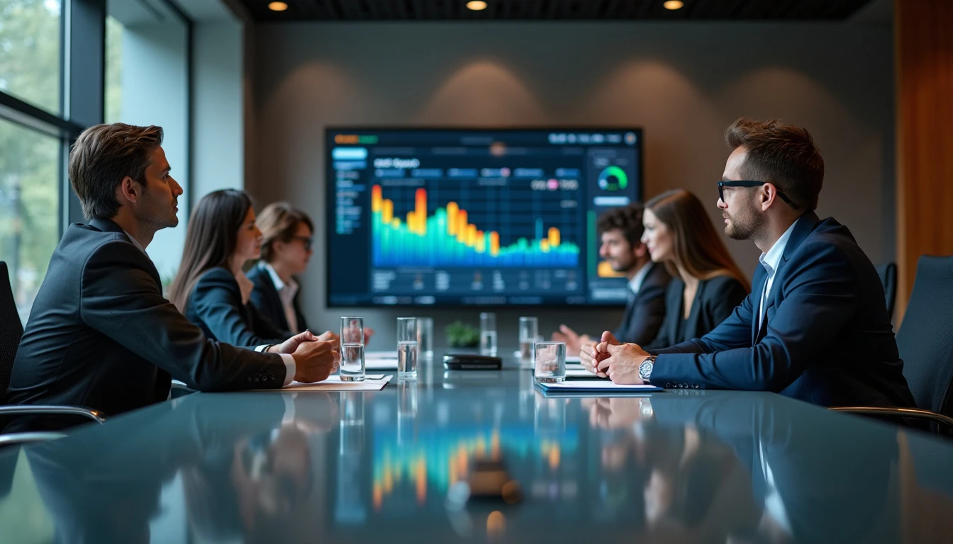 A law firm's financial team is gathered around a sleek, modern conference table, using a 24mm lens at f/5.6, implementing a protocol to prevent non-payment of legal fees and ensure financial stability. A large, high-resolution screen displays a financial dashboard, with a shallow depth of field to blur the surrounding environment and draw attention to the data. Soft, cool-toned lighting illuminates the scene, conveying a sense of professionalism and fiscal responsibility. The camera is positioned at a 45-degree angle, capturing the team's focused expressions and the vibrant colors of the screen, emphasizing the importance of financial planning