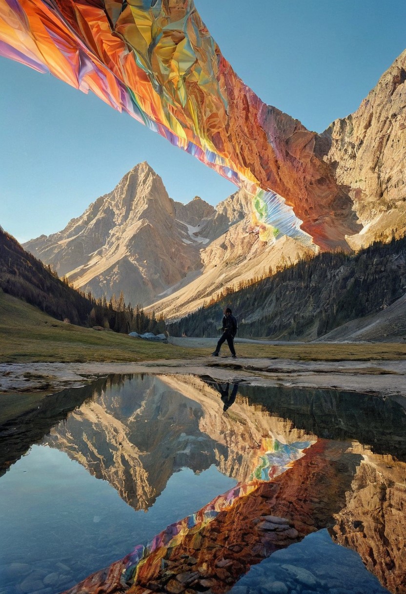 mountain warp into Mobius strips. A lone figure, suspended mid-air, appears trapped in an optical illusion of reflections and refractions colorful , professional photography, natural lighting, volumetric lighting maximalist. intricately detailed, complex, elegant, expansive, fantastical, film photography style, medium grain