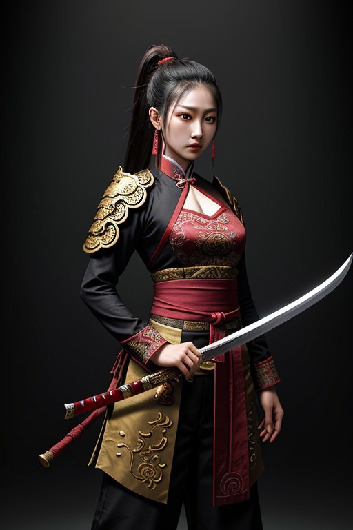 masterpiece, zhongfenghuaStyle, female oriental warrior, flowing garments, holding a katana by the hilt, dynamic shot, great directional lighting, highly detailed