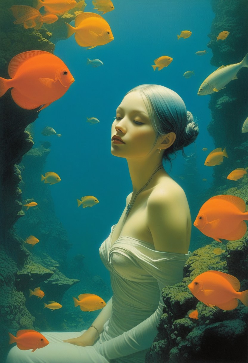 Curiosity, fascination, phosphorescence Artists: Mann, Gammell, Kley, Goldin, Gerome, Quentin Blake, Damien Hirst, Hajime Sorayama, Anne Bachelier, Gibson, Rockwell, Seagrave, Alberto Vargas, N.C. Wyeth, beksinski, Parrish Style: American Realism Color Palette: warm Vibrant, Parrish blue Techniques: impasto Details: idyllic, innocence, fractalize