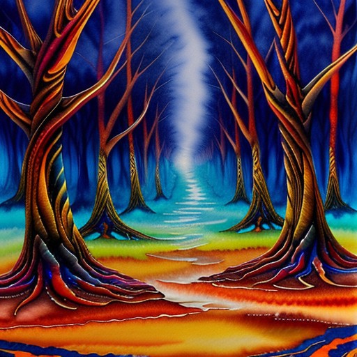 damascus steel, water colors print on a spooky dark forest 8k extreme detail, realistic, perfect, no mistakes, amazing, epic, vibrant colors, blue, red, orange, explosion in the background
