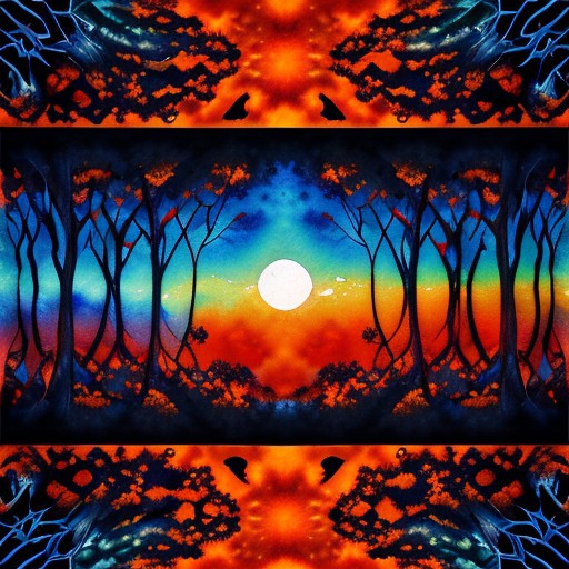 damascus steel, water colors print on a spooky dark forest 8k extreme detail, realistic, perfect, no mistakes, amazing, epic, vibrant colors, blue, red, orange, explosion in the background