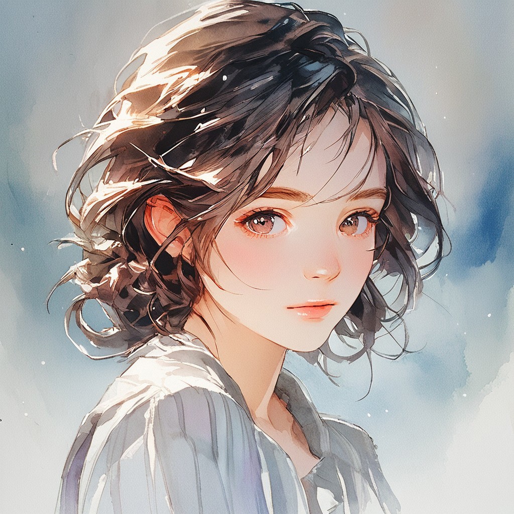 score_9, score_8_up, score_7_up, watercolor anime, 1woman, portrait, beautiful, hazel eyes, dark hair