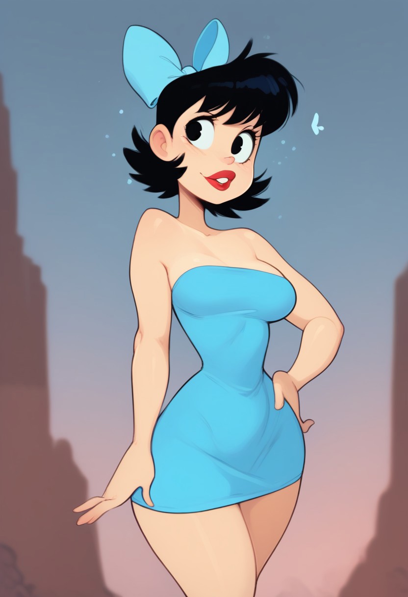 score_9, score_8_up, score_7_up, depth of field, ambient occlusion, bokeh, cel shading, black illustration lines, cinematic lighting, cartoon, solo, female, cute, short, red lipstick, hand on hip, breasts, wide hips, black hair, blue short dress, short hair, blue hair bow, black eyes, bare shoulders, Betty Rubble,