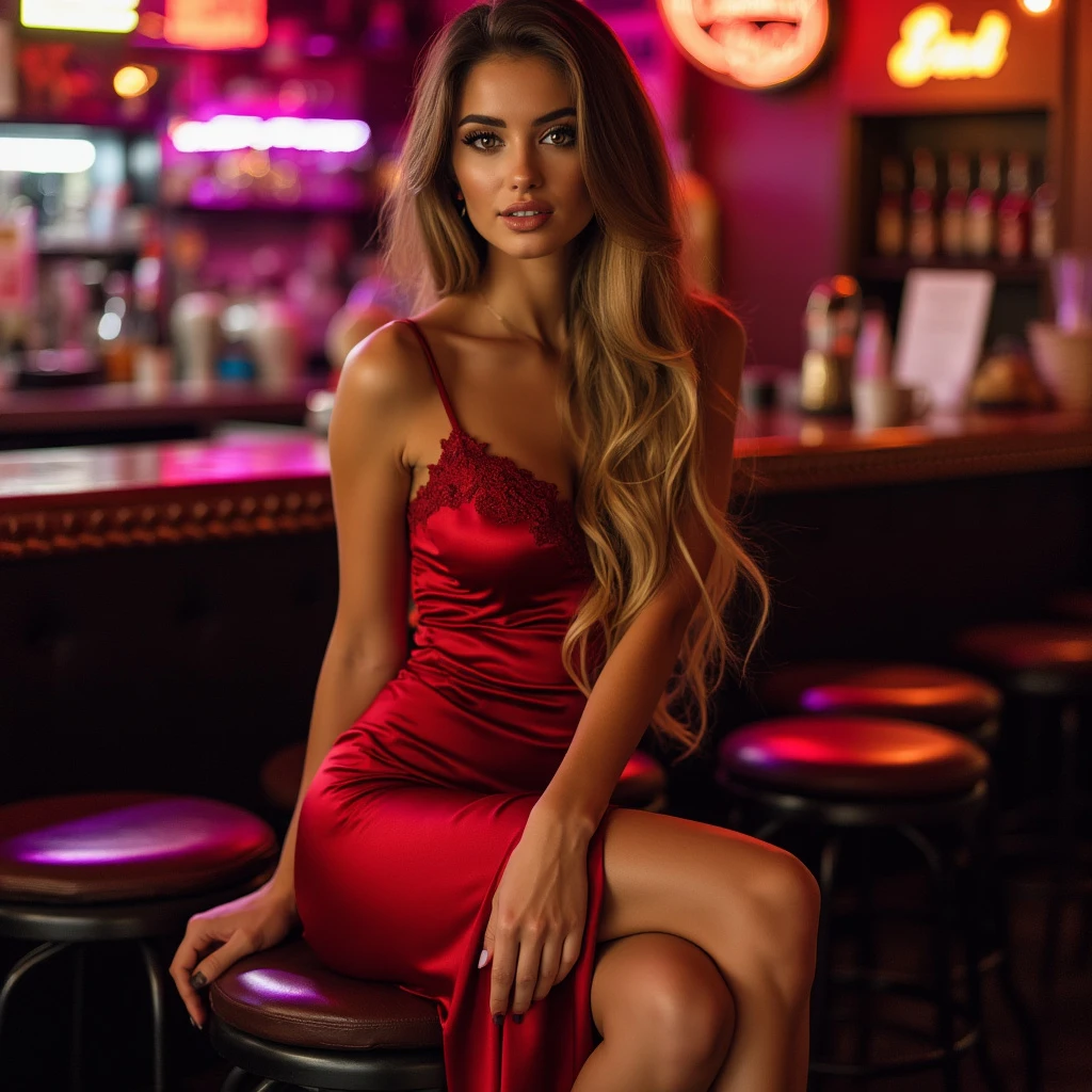 Beautiful stunning woman with long hair sitting in a club on a bar stool with her legs crossed wearing a red satin dress with lace details.