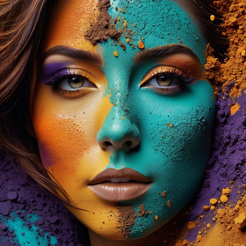 Abstract art. Medium shot. WOMAN'S face with brown hair and covered in dirt, having a nonplussed expression. close-up. Fine brushstroke, textured painting style. Swirling mix of turquoise and orange hues around face. Fragmented, overlapping details in deep purple and yellow tones. Low-key, natural lighting with warm, muted color palette. surreal, dreamy texture, highly stylized, vibrant colors, dynamic shapes, intricate, abstract shapes, expertly blended colors.