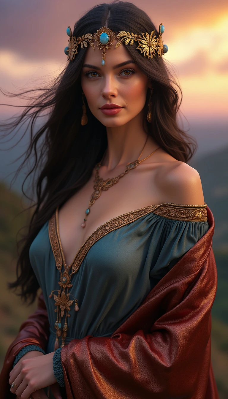 Photorealistic and detailed full body image of a strikingly beautiful woman with features reminiscent of Catherine Zeta Jones. She should have full lips, high cheekbones, and captivating, almond-shaped eyes with a deep, expressive gaze. Her long, dark brown hair should be sleek and slightly tousled, cascading over her shoulders. She wears a flowing drapery made of rich, shimmering fabrics in deep reds, golds and blues. The lighting should be soft and natural, highlighting her facial features and creating a subtle contrast with the background. The overall image should exude confidence and allure, with a focus on capturing the essence of timeless beauty. The image should be so realistic that it appears to be a high-quality photograph taken by a professional camera, with sharp details and natural shadows. The background features a distant view of rolling hills and a twilight sky, painted in hues of purple and orange, suggesting a magical realm. The woman's hair flows elegantly, adorned with a crown of intricate golden leaves and gemstones that glisten in the soft light. Her expression is serene yet powerful, embodying the essence of a goddess. The lighting is soft and diffused, casting a warm glow that highlights her features and the textures of her attire.