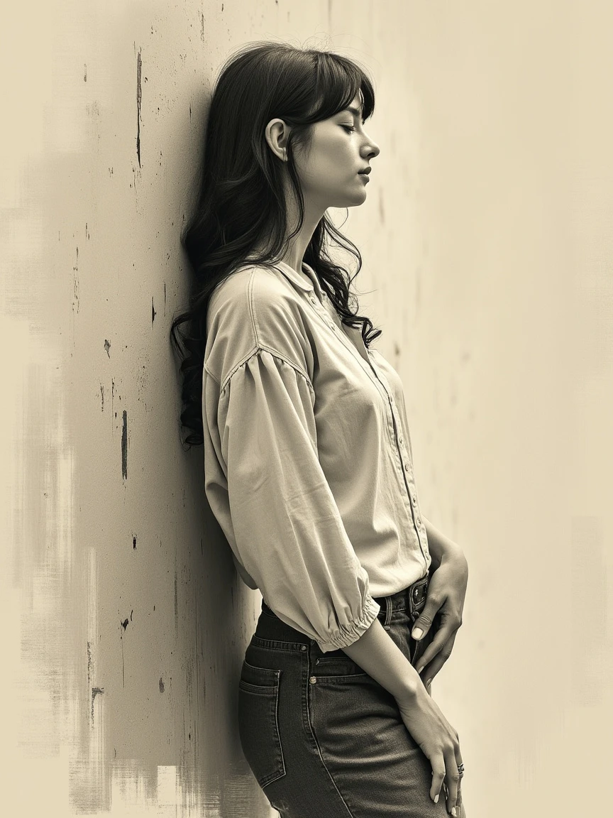 portrait drawing of a woman leaning against a wall, monochrome, ecru backgroundportrait drawing of a woman leaning against a wall, monochrome, ecru background