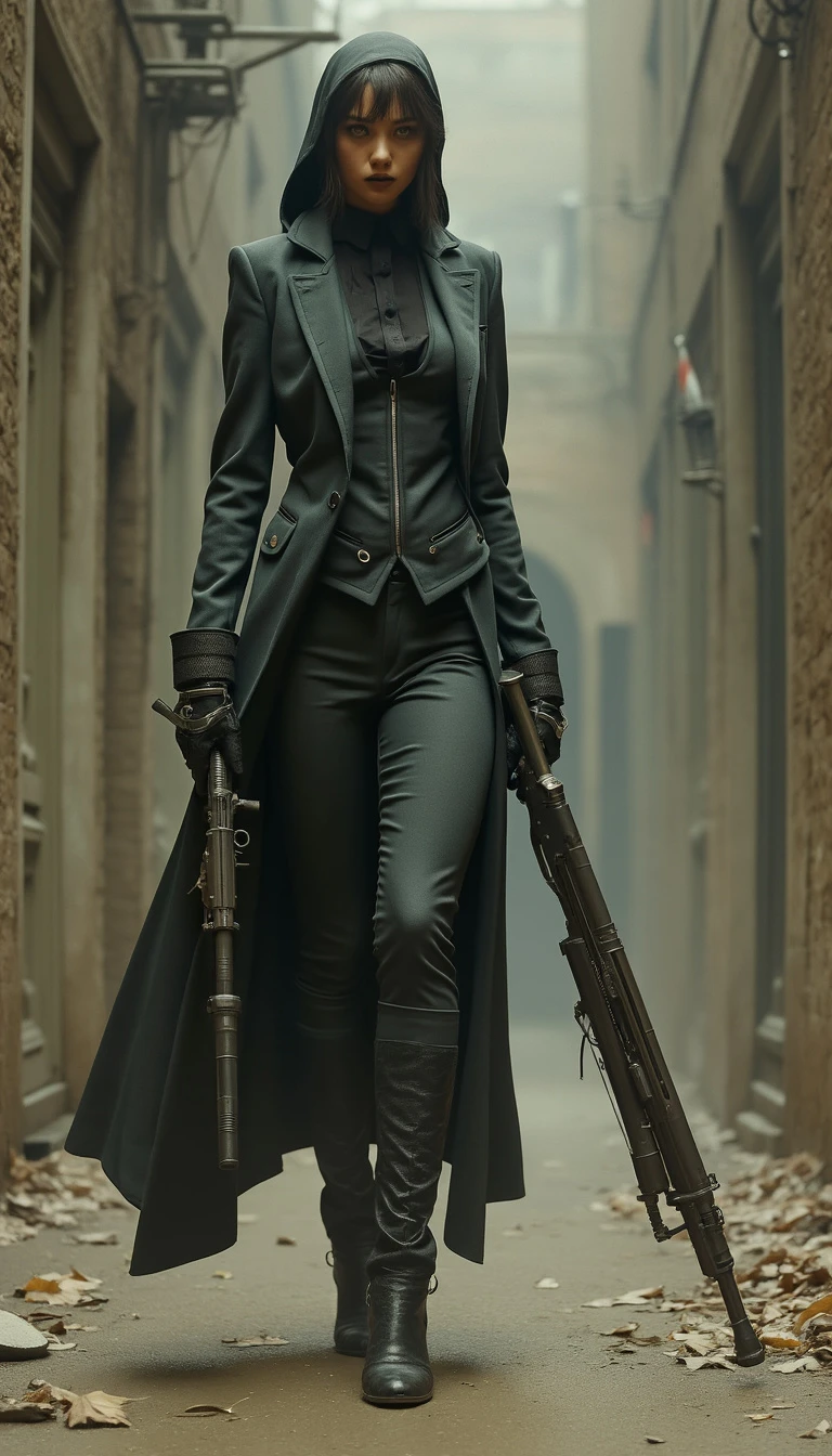 Full body female villain in suit with rifle, gangster. Cyberpunk + Zdzislaw Beksinski.