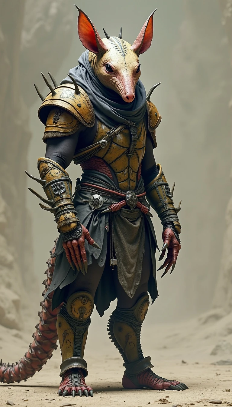 Full body anthropomorphic armadillo character. Cyberpunk + Dark souls.