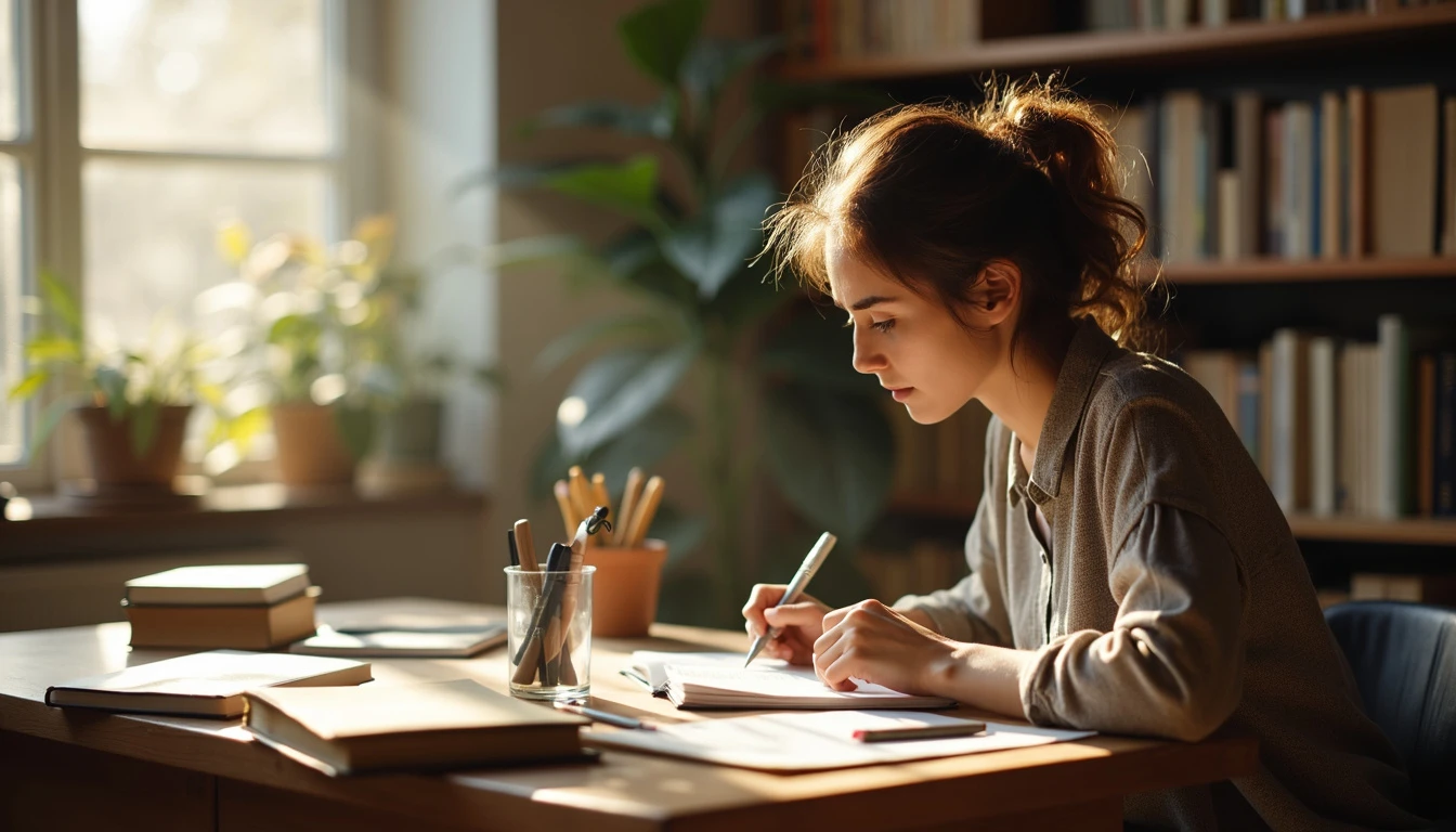 "Create a high-definition image for a 16:9 header on a landing page, showcasing a serene and organized workspace of a literary editor, with a subtle background of bookshelves and a few scattered manuscripts, while a warm light pours in from a nearby window, casting a gentle glow on the editor's focused face, as they intently review a manuscript on their desk, with a few pens and highlighters scattered around, shot from a 35mm focal length, with a shallow depth of field, and a shutter speed of 1/125s to convey a sense of quiet concentration, in a color palette of muted earth tones and creamy whites."