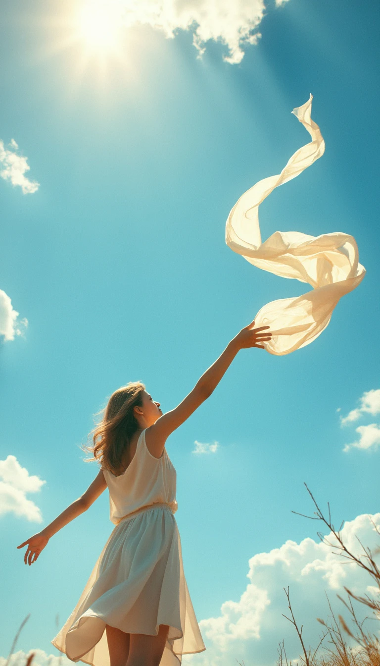 Scene: The background is dominated by a clear sky, painted in soft blue tones, with scattered white clouds that gently float across. The bright, warm sunlight filters through the clouds, creating a radiant, sunlit atmosphere that suggests a calm, yet vibrant day. Character: In the center of the image stands a single figure, depicted from a low angle, as if viewed from the ground looking upward. The person appears strong and poised, their stance open and confident, suggesting a moment of motion captured in time. Position: One of the character’s arms is extended upward, adding a sense of movement and purpose. The second arm is not visible, possibly obscured by the flowing fabric or positioned behind them. This dynamic pose creates a sense of action, as if they are reaching for something beyond the frame or embracing the freedom of the open air. Key Detail: A delicate, translucent fabric or scarf is held in the raised hand, fluttering in the breeze. The sunlight catches this fabric, illuminating it with a soft glow, and casting gentle shadows on the figure. The way the fabric moves in the wind adds grace and fluidity to the scene, making the moment feel ethereal. Atmosphere: The overall feeling of the image is one of liberation and vitality. The combination of the figure’s open posture, the fluttering fabric, and the bright, expansive sky evokes a sense of freedom, as if the person is experiencing a pure, unrestrained moment of joy and movement.