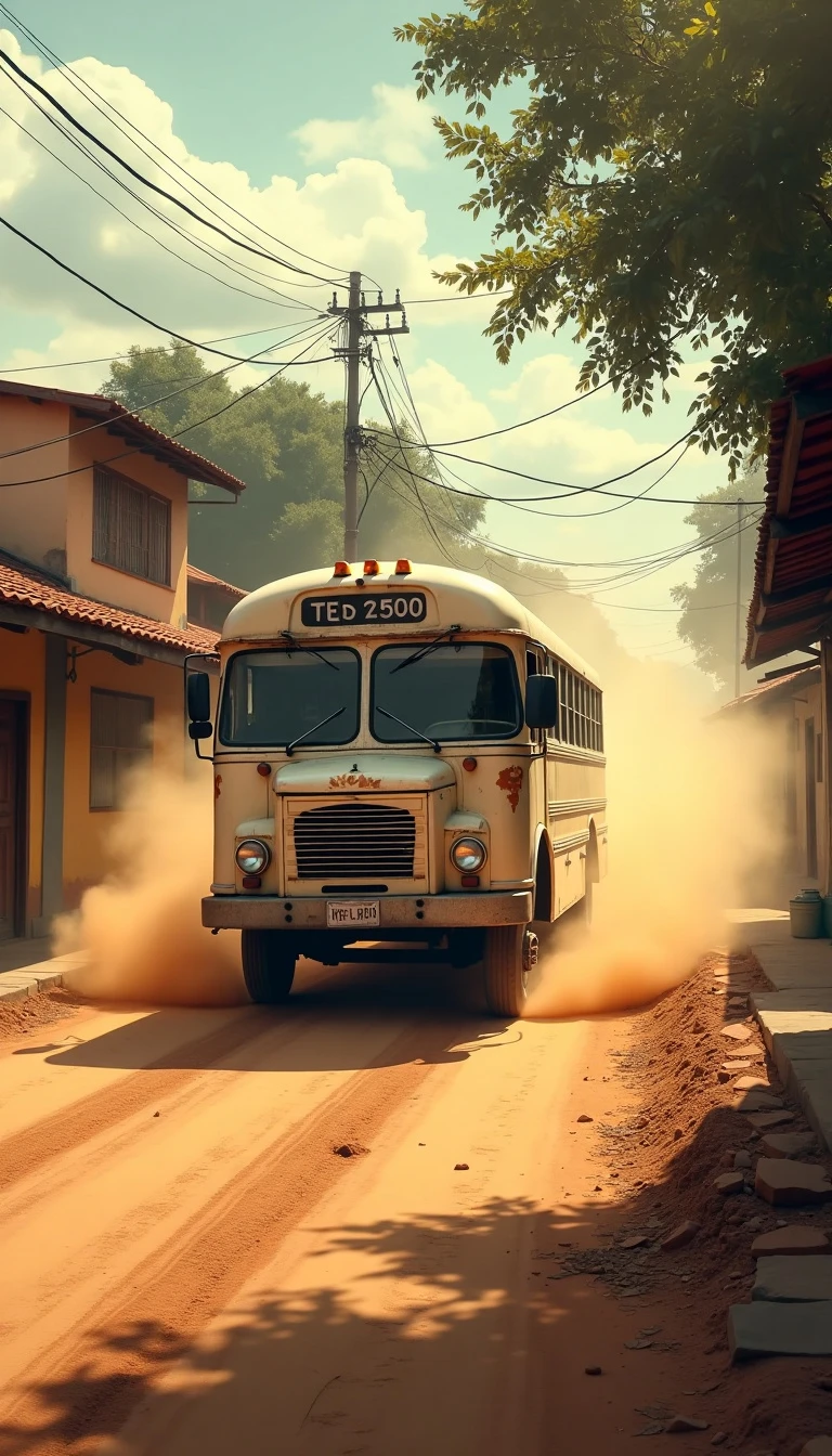 Subject: A standard 1970s model bus arriving in São Sebastião, kicking up a cloud of dust. Composition: Wide shot, focusing on the bus and the dusty road in the foreground, with the village buildings in the background. Visual Details: Warm, muted colors, long shadows, a sense of quiet anticipation. Action and Emotion: The bus is coming to a stop, kicking up dust in the air. Character Details: None. Environmental Details: Late afternoon, the sun hangs low in the sky, casting long shadows with a warm, orange-red hue (Pantone 16-1360 TCX). The air is thick with dust particles, fine and powdery, light tan in color, suspended in the air, creating a hazy atmosphere. The smell of damp earth and decaying leaves is strong, a gentle breeze rustles the leaves of nearby trees, the distant cawing of crows is the most prominent sound. Object States: The bus is stopping, kicking up dust. Object Descriptions: - Bus: Material: Steel body with glass windows and rubber tires. Shape and Size: Standard bus size, approximately 40 feet long, 8 feet wide, and 10 feet tall. Color: A faded shade of white with some rust spots visible on the body. Texture: The body is smooth metal with a slightly rough texture due to the aging paint. Features: Standard bus features, including headlights, windshield wipers, and a rear door. Condition: Shows signs of wear and tear, with faded paint and some rust spots. - Dust: Fine particles of earth and sand, light tan color, powdery texture. - São Sebastião: A small village with simple houses and buildings, unpaved streets. The houses are mostly constructed from mud brick and wood, with faded paint and peeling plaster. The roofs are tiled, some with missing tiles, revealing the wooden beams underneath. The windows are mostly boarded up, with a few cracked and dusty panes of glass still intact. The streets are unpaved and dusty, with deep ruts from the passage of vehicles. A few trees line the streets, providing sparse shade. Art Style: Photorealistic with a touch of Magical Realism
