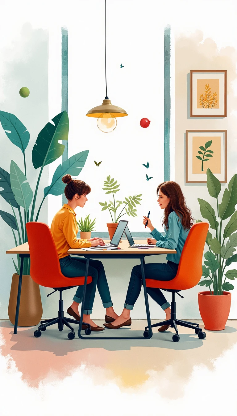 Create a high-resolution aquarelle illustration of clients at work, set against a crisp white background. The scene should feature a mix of turquoise, orange, and white hues, with pops of red accents to add vibrancy. The clients should be depicted in a natural, relaxed pose, surrounded by subtle hints of office supplies and equipment. The overall composition should evoke a sense of professionalism and collaboration, with a touch of playfulness. Consider incorporating gentle watercolor textures and subtle brushstrokes to enhance the illustration's organic feel. Aquarelle illustration, clients at work, white background, turquoise, orange, white, red accents, high resolution, natural pose, office supplies, collaboration, professionalism, playfulness, watercolor textures, subtle brushstrokes.