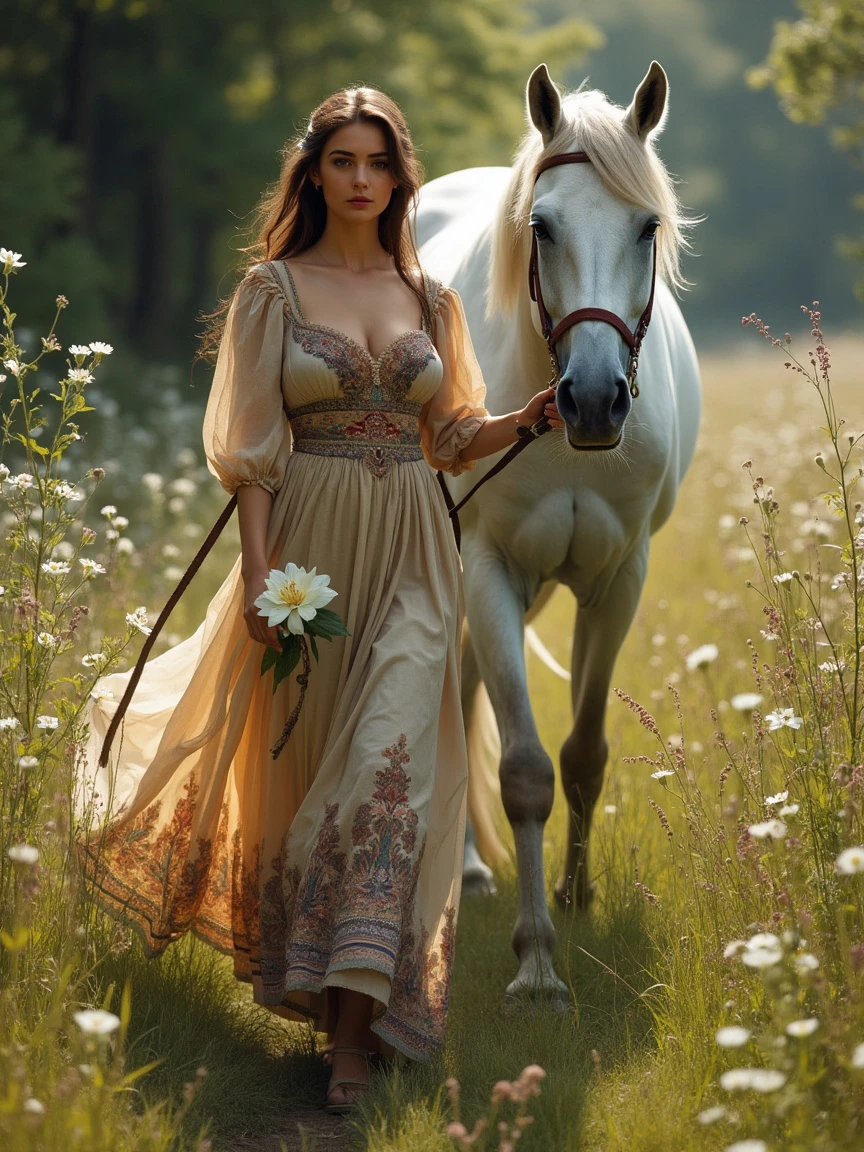 A masterpiece work by Thomas Benjamin Kennington in the style of the artist, Front view, a beautiful Persian woman, with usual daily dress with Persian carpet design pattern, walking beside white horse, clutching lily, amidst an English meadow in early summer, flowering trees circle, scene influenced by gusty light breeze moving flowers and tall grass, Greg Rutkowski inspiration mixed with Luis Royo and Pino Daeni nuances, with a touch of Wadim Kashin ambiance, ultra-detailed