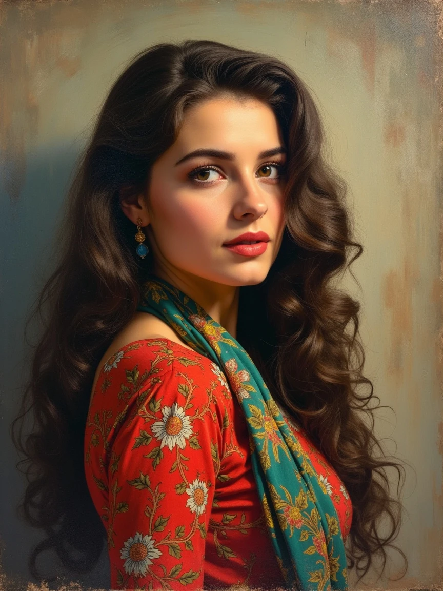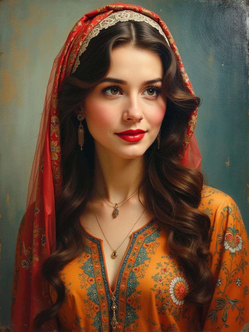 beaty woman portrait from Hollywood actress ,colorfull, from 1935 , long hair , with persian dress with persian pattern, with colorfull scarf , art oil painting style, art oil painting style , art oil painting style, close up, oil painting old master, dynamic light, cinemaic light, glow background, vintage style, oil painting striking brushstrokes background grayish, by konstantin razumov, Jean Baptiste Monge