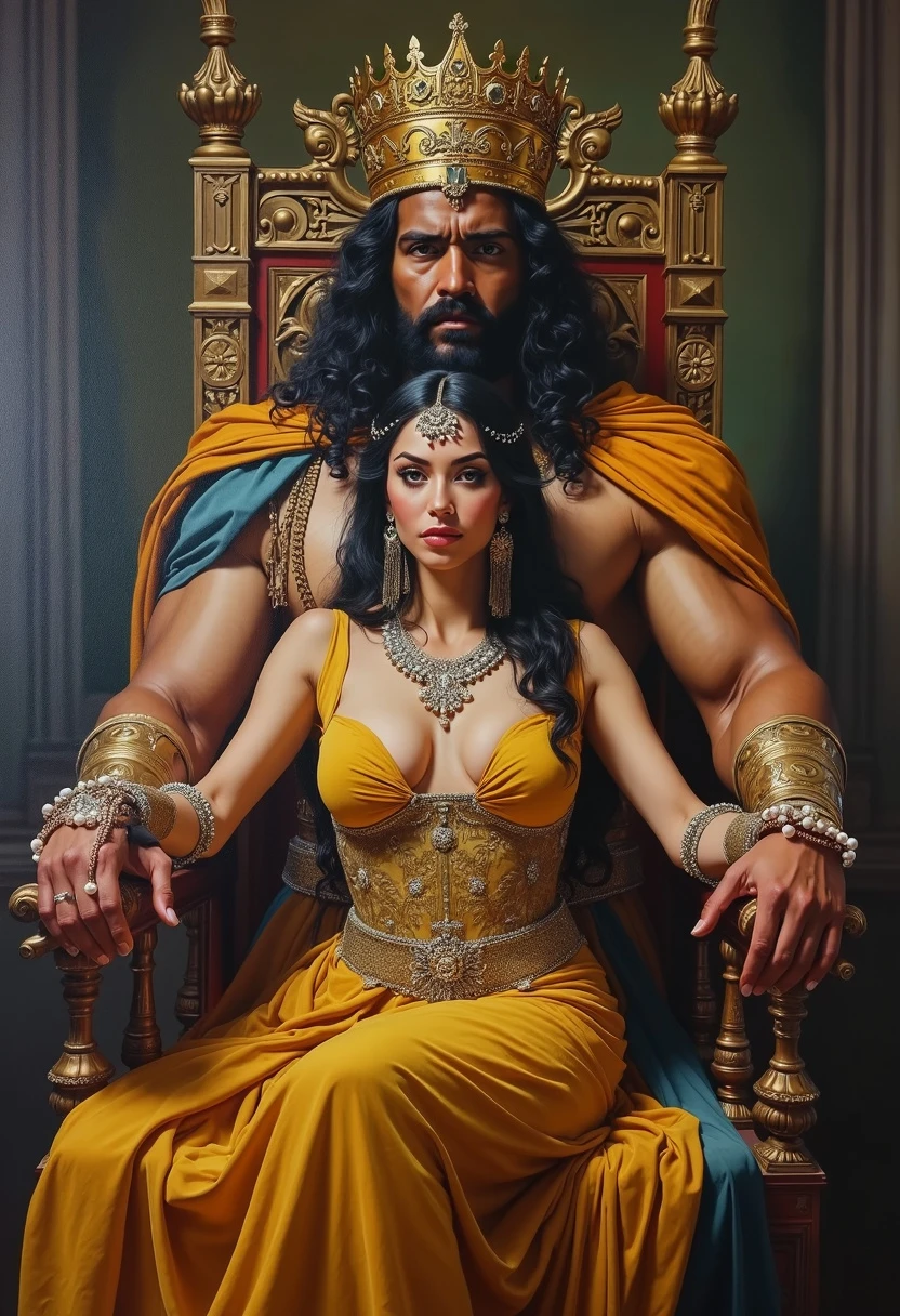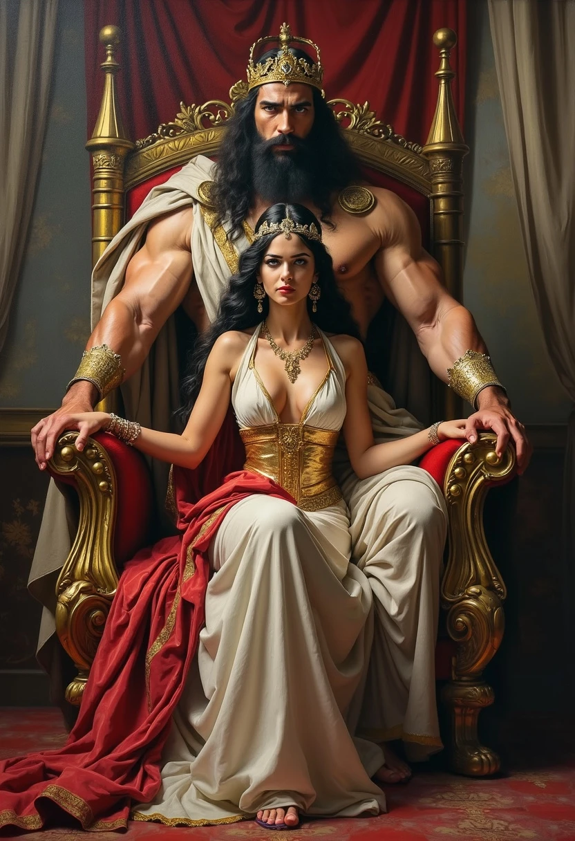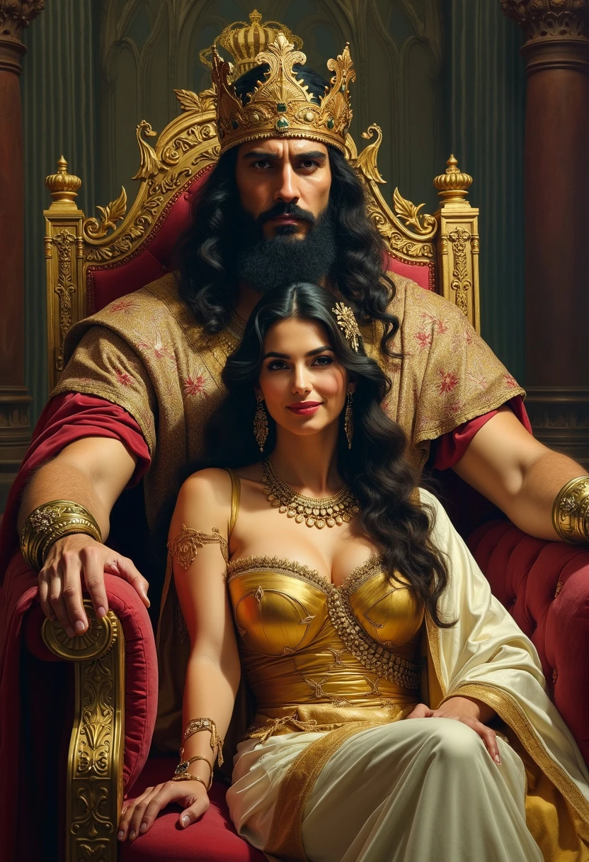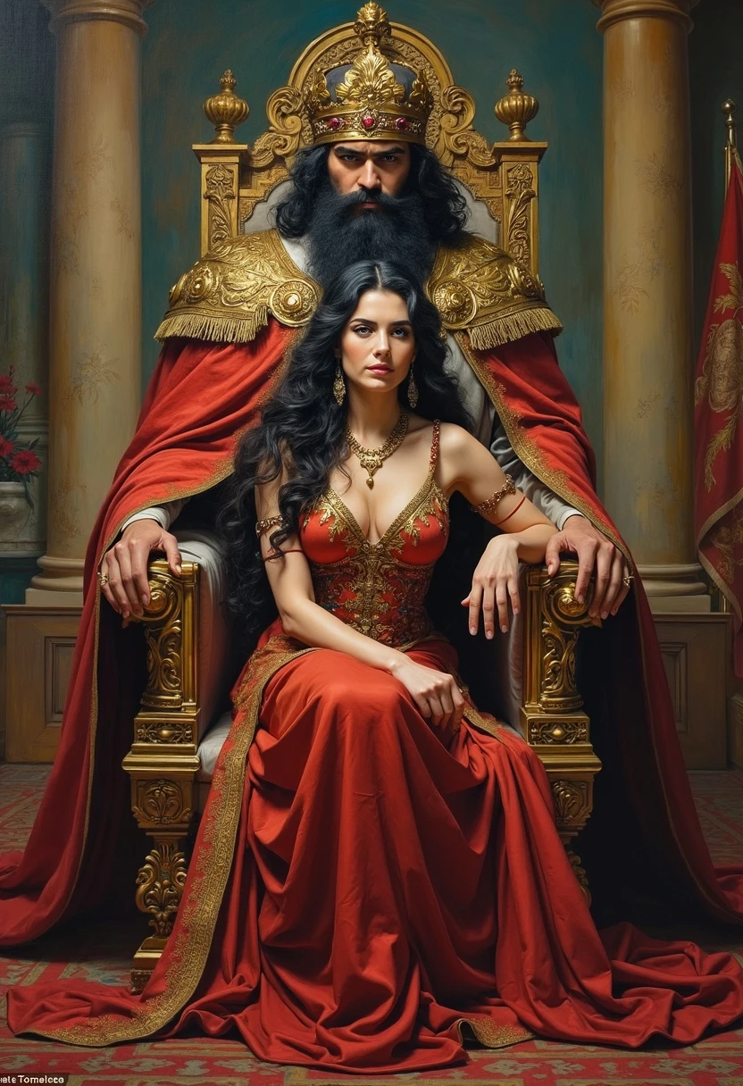 A stunningly detailed and hyperrealistic oil painting, masterfully blending the styles of renowned artists such as Norman Rockwell, Steve Hanks, Moebius, Dalhart Windberg, Boris Vallejo, The Brothers Hildebrandt, Jen Christiansen, N.C. Wyeth, and Edward Hopper. Signed by the talented artist Tomelee, this magnificent painting showcases a powerful big sized Persian king with a majestic crown and a beutiful queen in an opulent, throne room. The protagonists are rendered with anatomically accurate figures, faces, and hands, exhibiting intense vibrant colors and dramatic lighting. royal theme background , allowing the captivating characters to stand out. The scene exudes a sense of grandeur , with the king standing behind the throne, and the queen seated on it, both exuding strength and determination