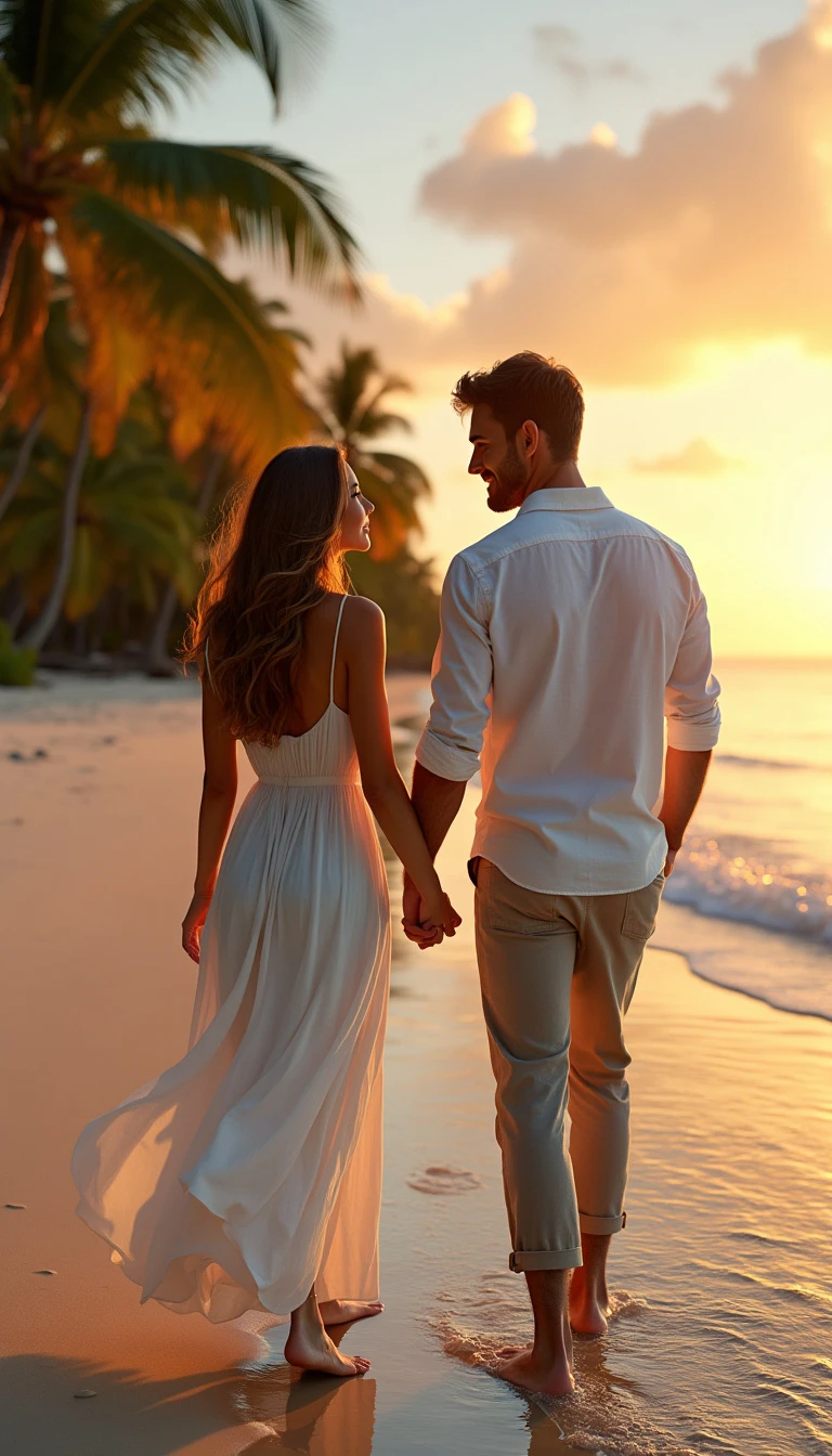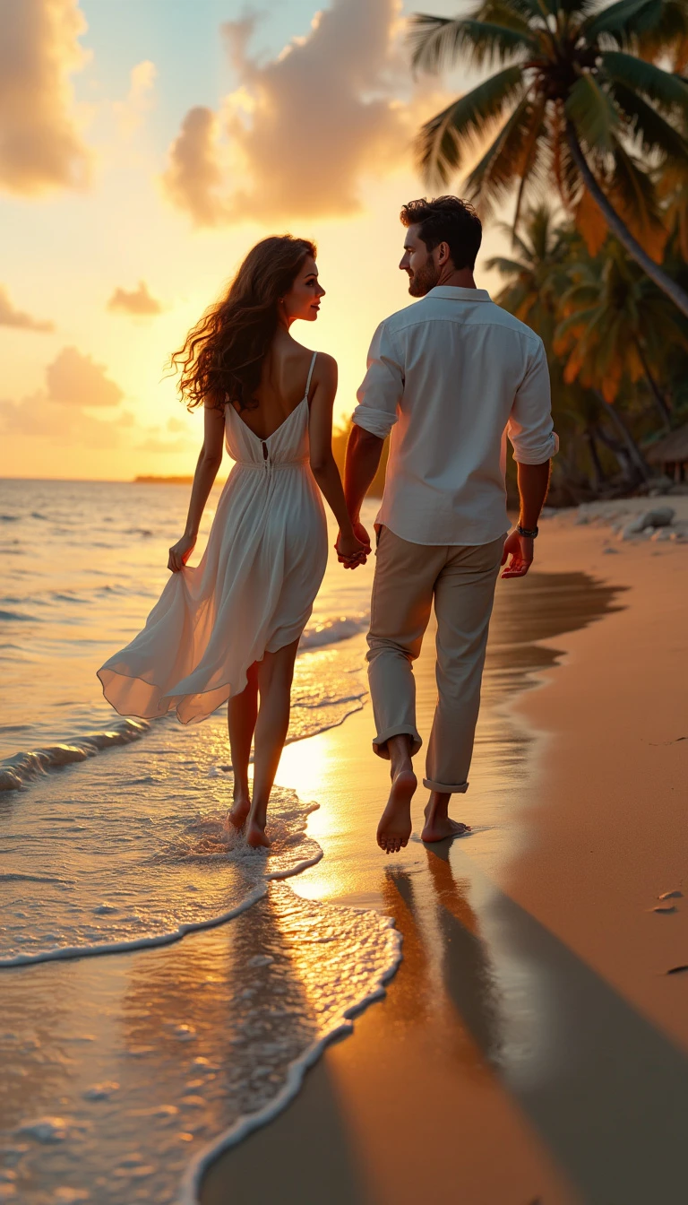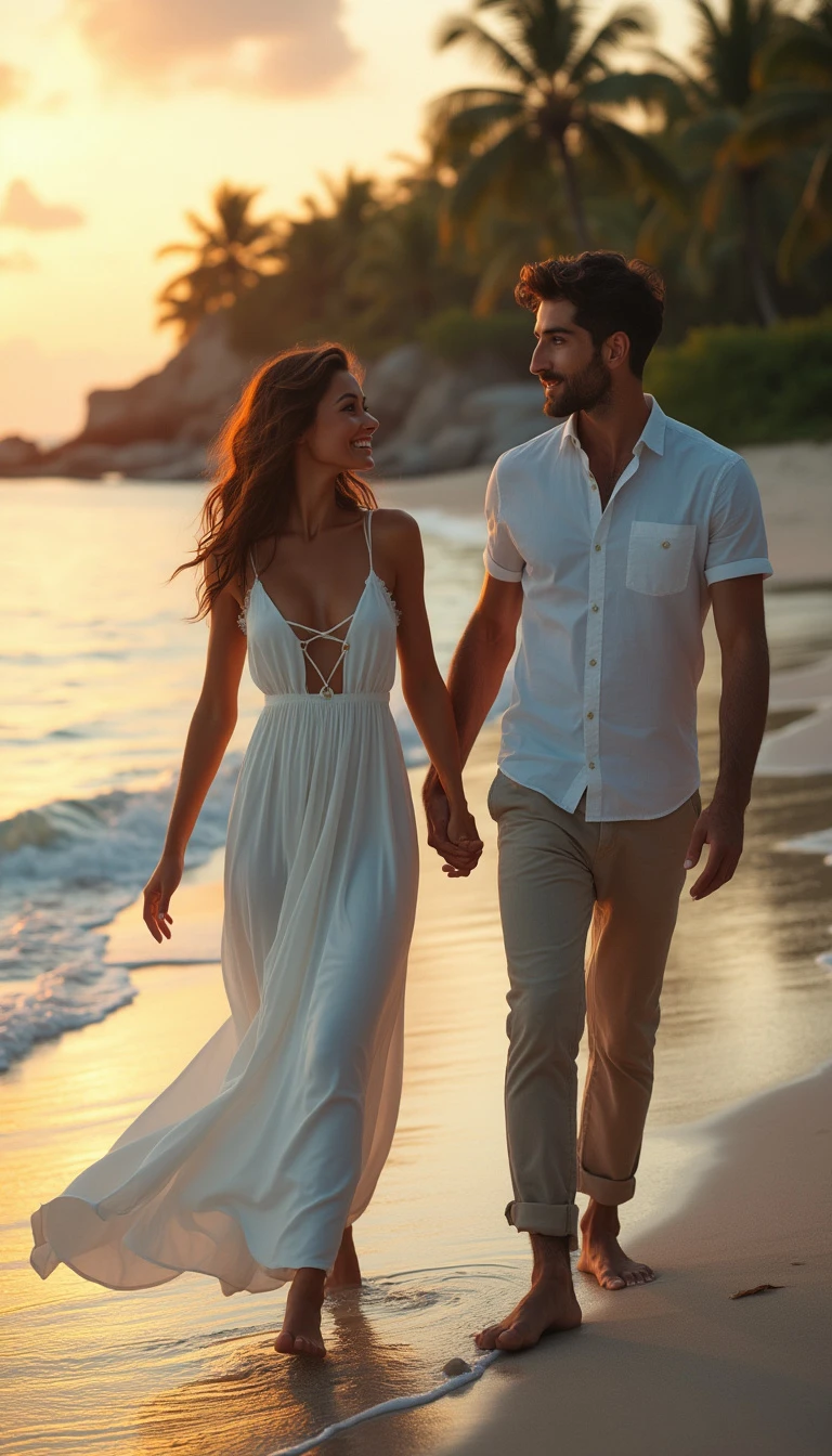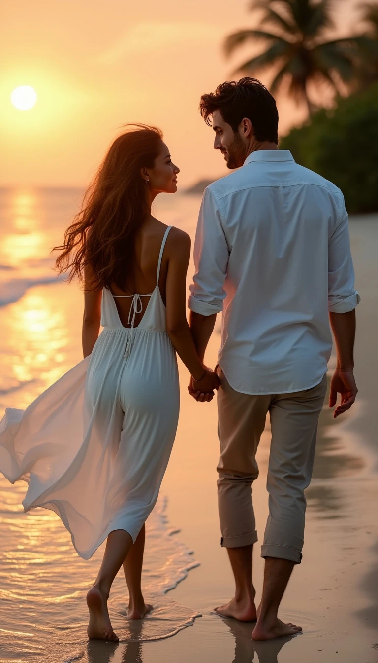 "Captures a hyper-realistic image of a couple walking barefoot along a secluded tropical beach at sunset, holding hands and exchanging intimate glances. The woman, 28, has olive skin, long wavy brown hair and warm hazel eyes. She wears a flowing white summer dress, perfect for a serene beach setting. The man, 32, is slightly taller with tanned skin, short dark brown hair and deep blue eyes. He has a slim yet toned physique and wears beige linen trousers and a relaxed-fit white shirt. A soft orange glow from the sunset reflects on the water, while palm trees in the distance sway gently in the breeze. The scene is shot with a cinematic drone, offering aerial views and intimate close-ups of the couple's tender bond."