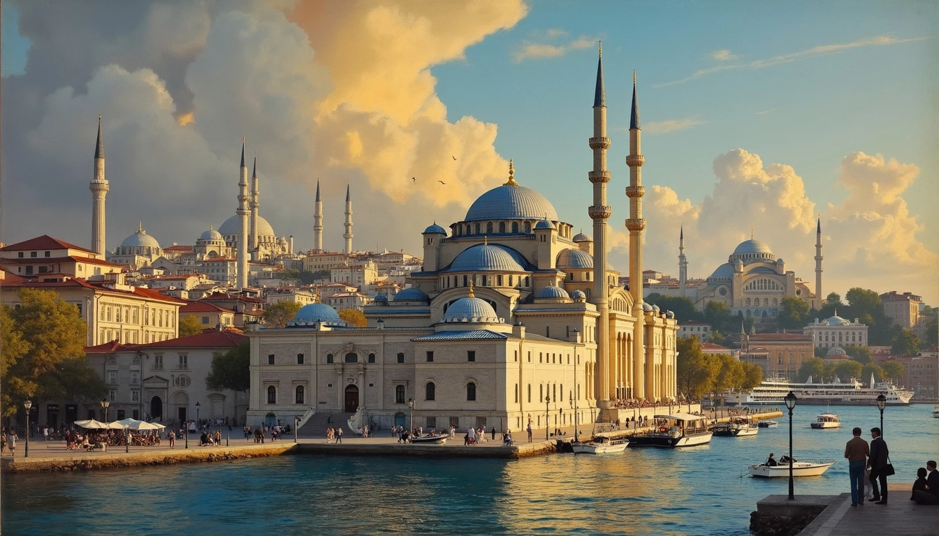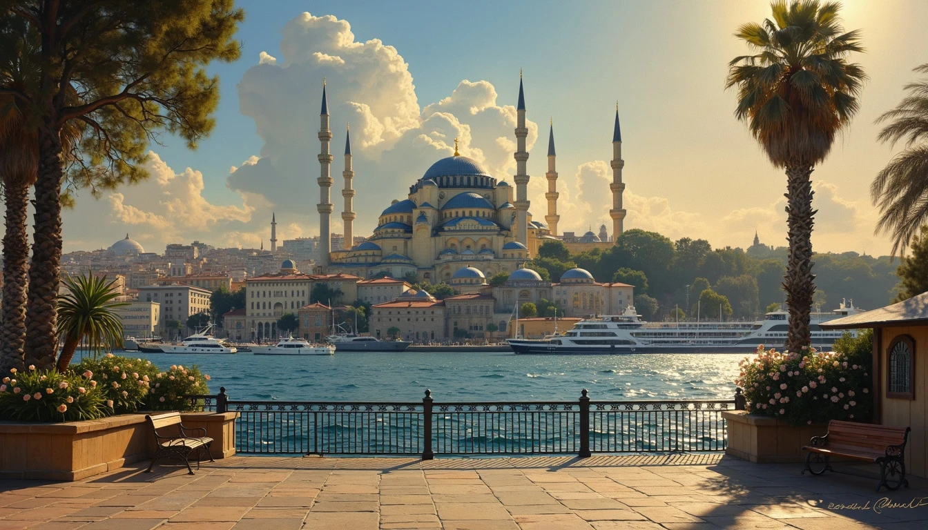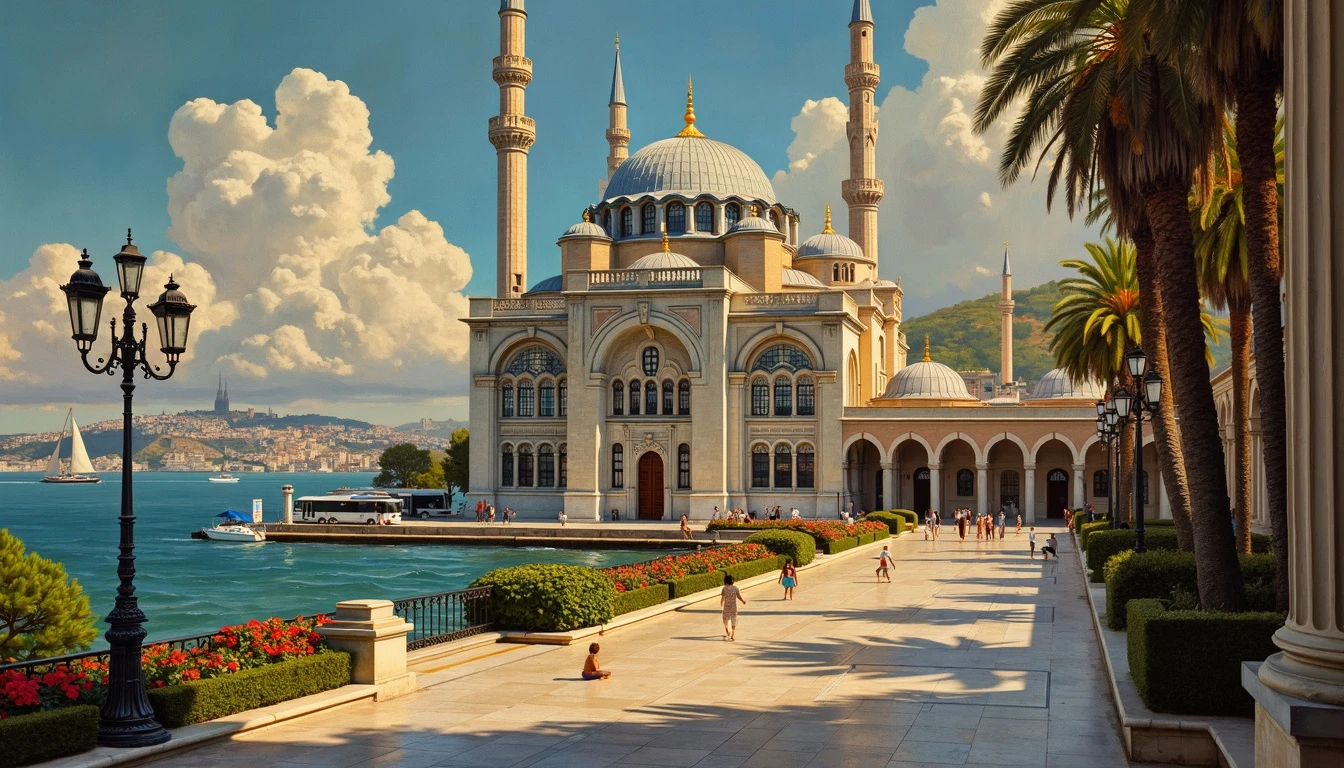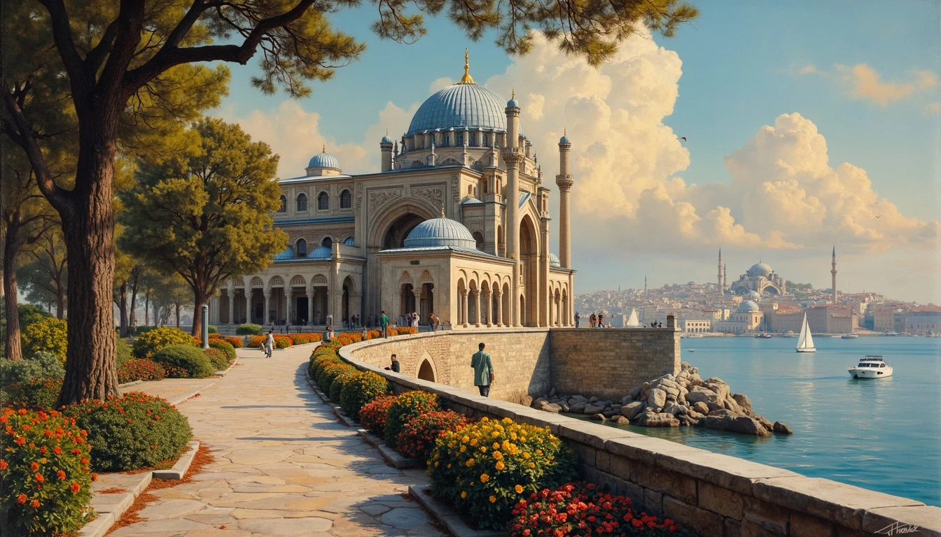 A masterpiece work by Thomas Benjamin Kennington in the style of the artist, A stunningly detailed and hyperrealistic oil painting, masterfully blending the styles of renowned artists such as Norman Rockwell, Steve Hanks, Moebius, Dalhart Windberg, Boris Vallejo, The Brothers Hildebrandt, Jen Christiansen, N.C. Wyeth, and Edward Hopper. Signed by the talented artist Tomelee, this magnificent painting showcases A beautiful view of the Turkish Topkapi Palace Museum landscape