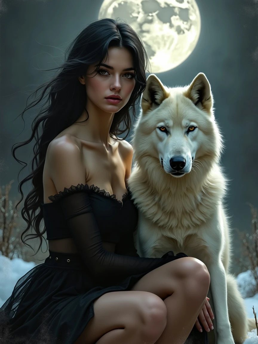 A masterpiece work by Thomas Benjamin Kennington in the style of the artist, beautiful woman with black hair and black eyes , her image perfect in anatomy and facial features, dynamically centered under moonlight as she gazes directly at the camera, approaching perfection. A large white wolf sits next to her