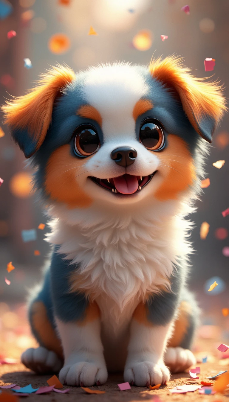 A small, fluffy dog with orange, white, and blue fur sits in the center of the frame, facing the viewer. The dog has large, expressive eyes and a sweet expression. The dog is surrounded by a soft blur of colorful confetti, creating a whimsical and playful atmosphere. The lighting is soft and warm, casting a gentle glow on the dog's fur. The dog is rendered in a realistic style with a focus on detail, particularly in the fur. The overall feel is one of innocence and joy.