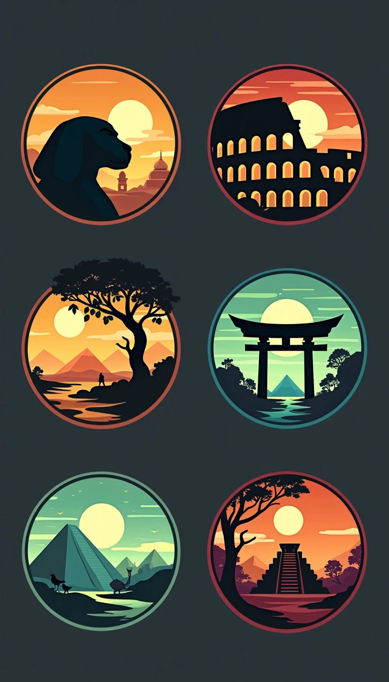 Design six circle-shaped icons, each representing an element strongly associated with Norse, Greek, Roman, Egyptian, Japanese, and Aztec mythologies. **Design:** - circle shape with a simple line border - Solid color background Icon Descriptions: Greek: The Parthenon temple silhouette. Roman: The Colosseum in silhouette, with sunset behind it. Egyptian: The Great Sphinx with desert sands and pyramids in the distance. Norse: Yggdrasil (the World Tree) with Odin's ravens perched on its branches. Japanese: a torii gate, with cherry blossoms scattered in the background. Aztec: The silhouette of Chichen Itza, glowing with a deep turquoise light. **Style:** Use simple, iconic representations of each element. Stick to two or three colors per icon for clarity.