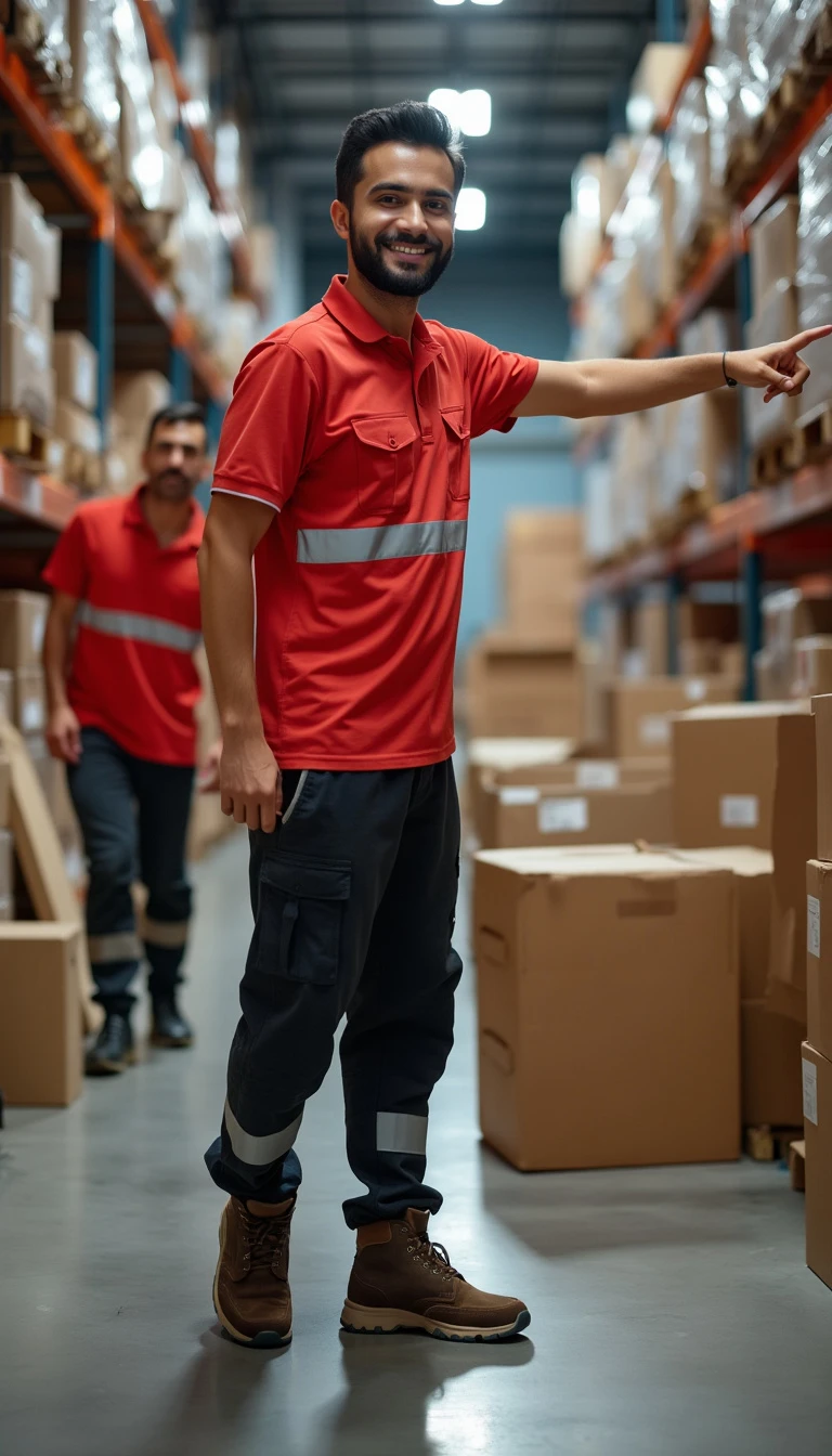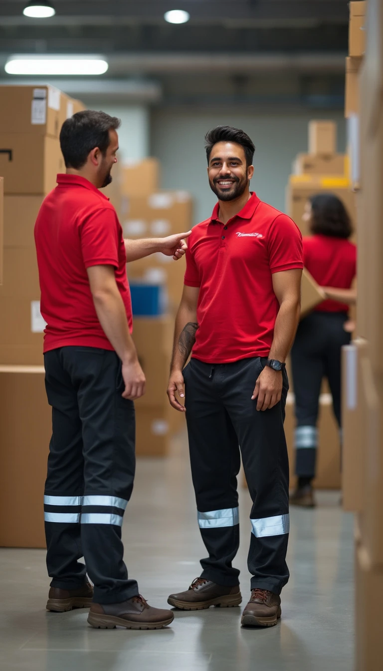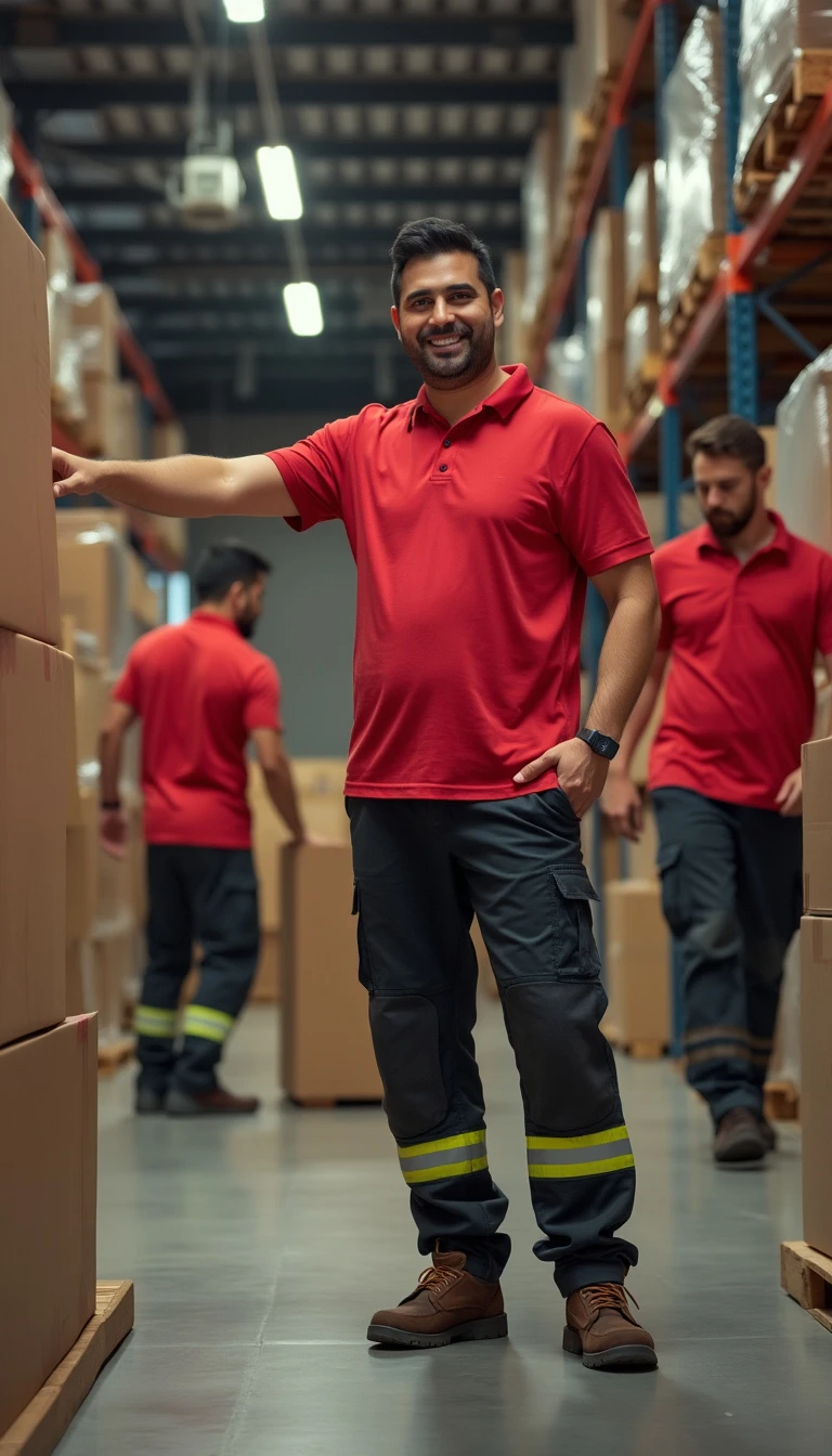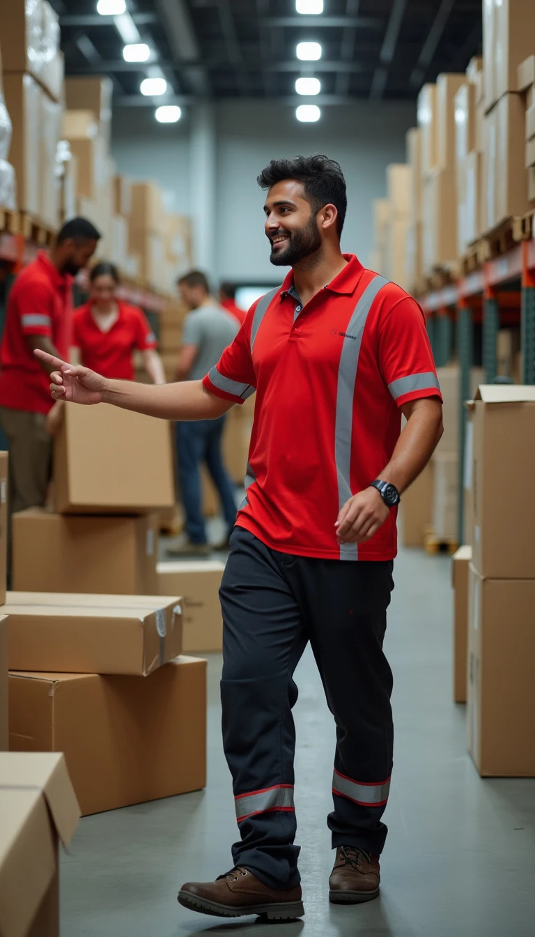 Juan is dressed in a comfortable red polo shirt with reflective safety stripes, with black sweatpants with reflective safety stripes at the knees, tailored for a perfect fit. On his feet, he is wearing comfortable dark brown shoes, and a few coworkers are in the warehouse, working together to separate the useful from the unnecessary. They are seen removing damaged boxes and stacking empty boxes to the side. The space is starting to clear out. Juan is pointing at a stack of boxes with a satisfied smile, while the others continue to move objects. The scene has a collaborative atmosphere, with soft lighting that highlights the details of the warehouse. Put the text “Diamond swe” on his t-shirt