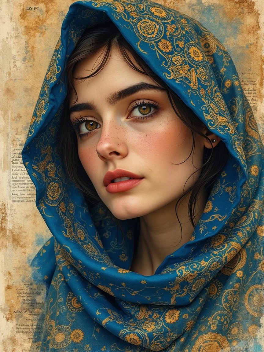 Create a mixed media art piece featuring a central realistic persian woman with splashes of watercolor and ink around it made entirely of swirling, golden paisley patterns.. Incorporate elements of desert palace, using various persian carpet design to add texture and depth. Include abstract geometric shapes and faded biblical pages with numbered verses to give a sense of layered history. The color palette should be subtle with hints of vibrant blues to draw attention to the eye., depth of field, cinematic lighting, UHD, retina, masterpiece, accurate, anatomically correct, textured skin, super detail, high details, award winning, high quality, best quality, highres, 4K
