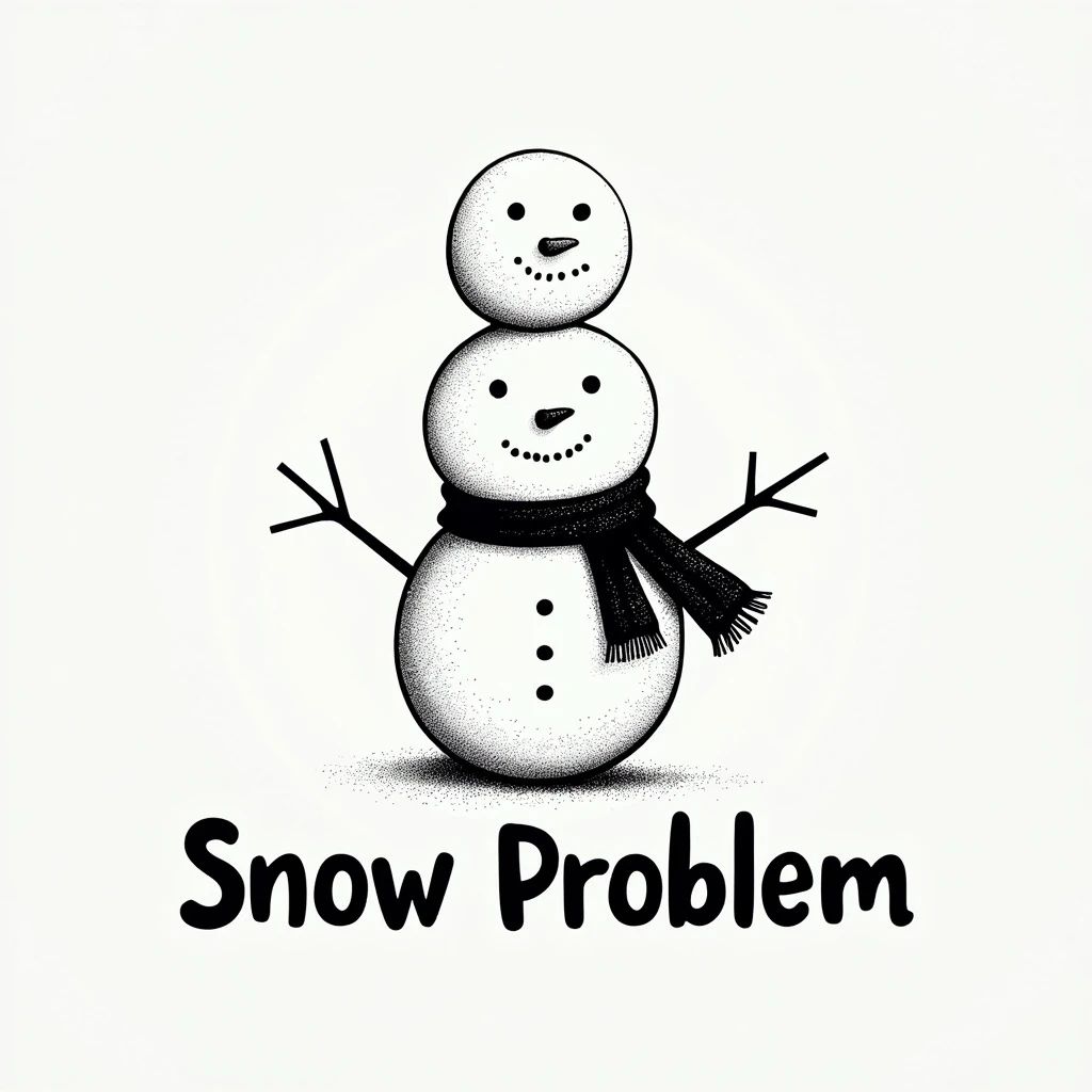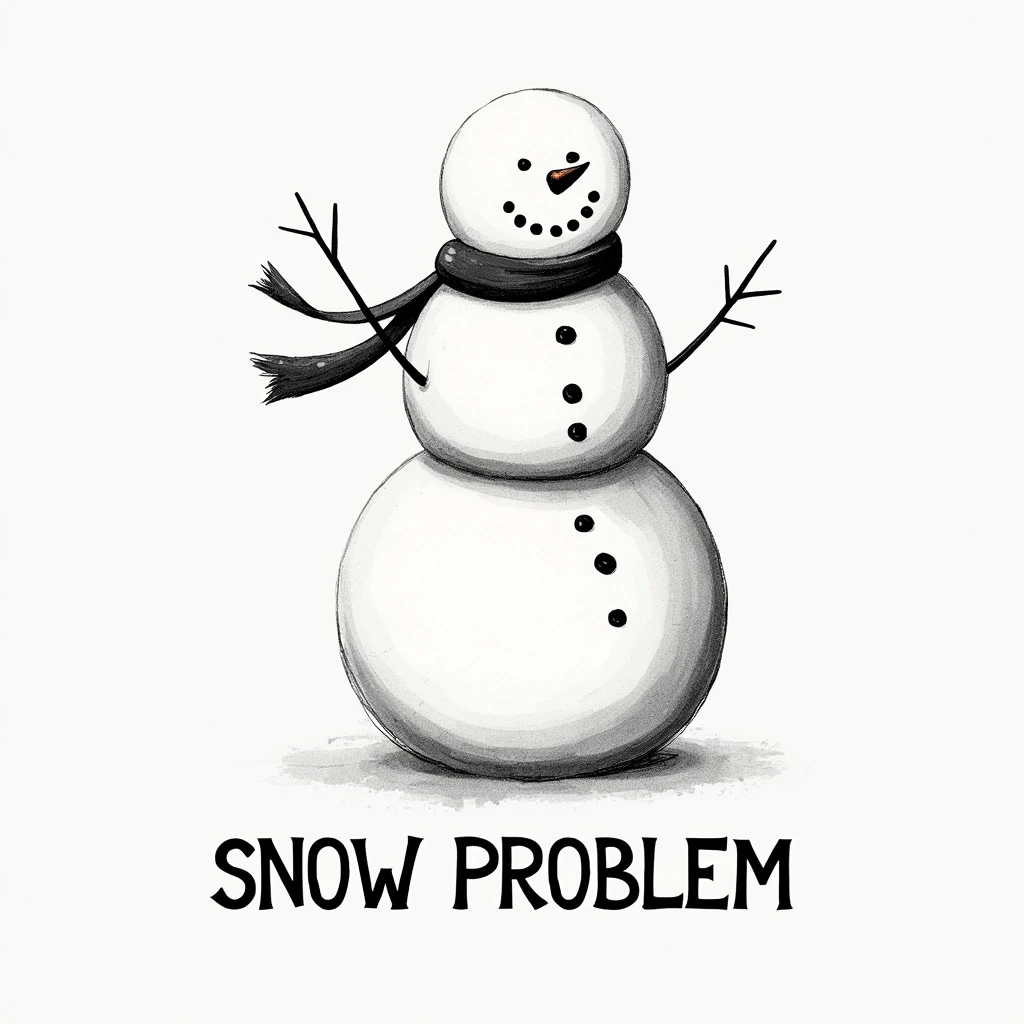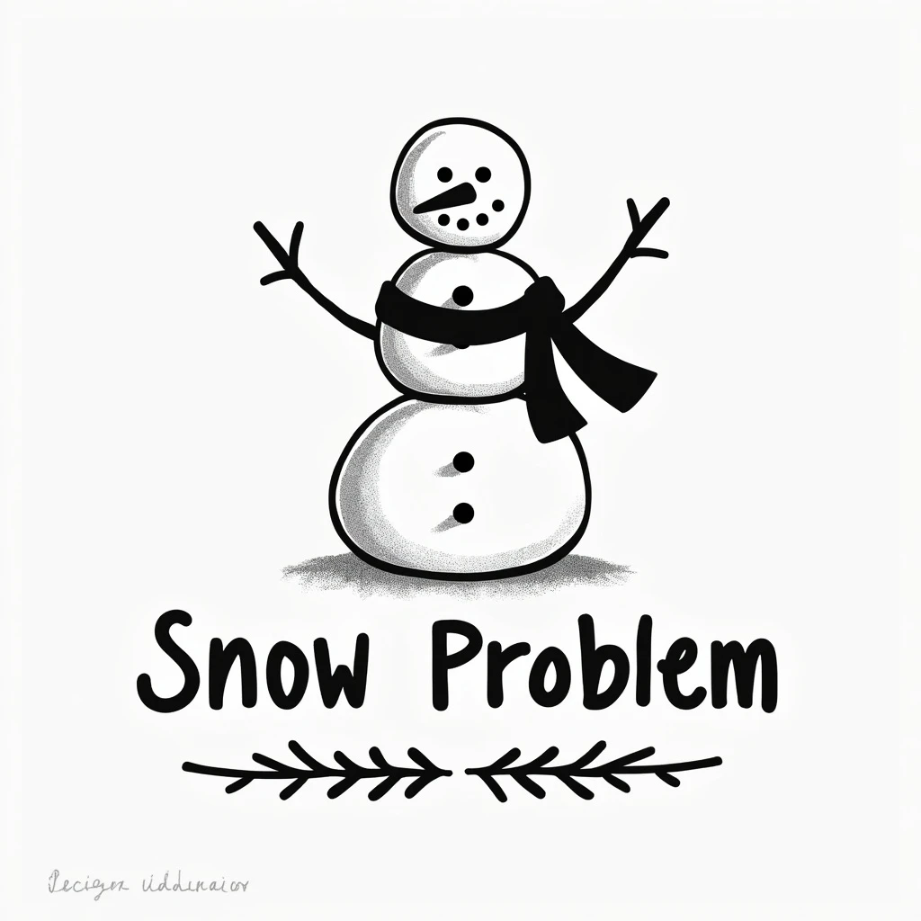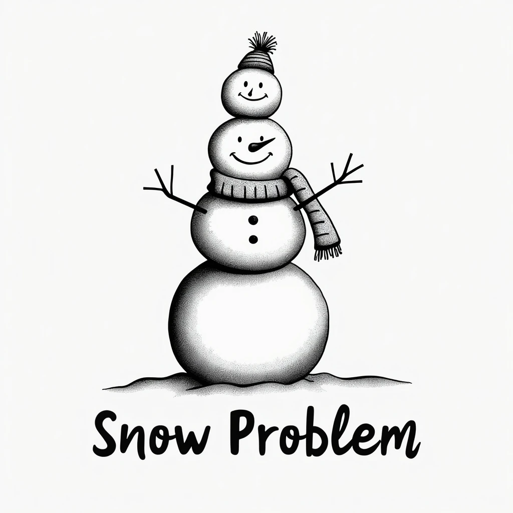 Design Description: A minimalist snowman design made up of three simple, perfect circles stacked on top of each other. The face is designed using tiny black dots for the eyes and mouth, and a straight line for the nose, hinting at a carrot. The snowman's scarf is formed with two straight lines, flowing elegantly to the side. Beneath the snowman, the text "Snow Problem" is written in playful yet simple lowercase font. The design aims for humor in its simplicity, while maintaining a clean aesthetic. Visual Elements: Three stacked circles forming a snowman. Tiny black dots for facial features and straight lines for accessories. Text: "Snow Problem" in playful font, matching the minimalist style. Color Palette: Monochrome black and white with a hint of gray shading for depth. Potential Application: Perfect for T-shirts, mugs, or notebooks for a witty, minimalist Christmas theme. Background: Isolated on a white background.