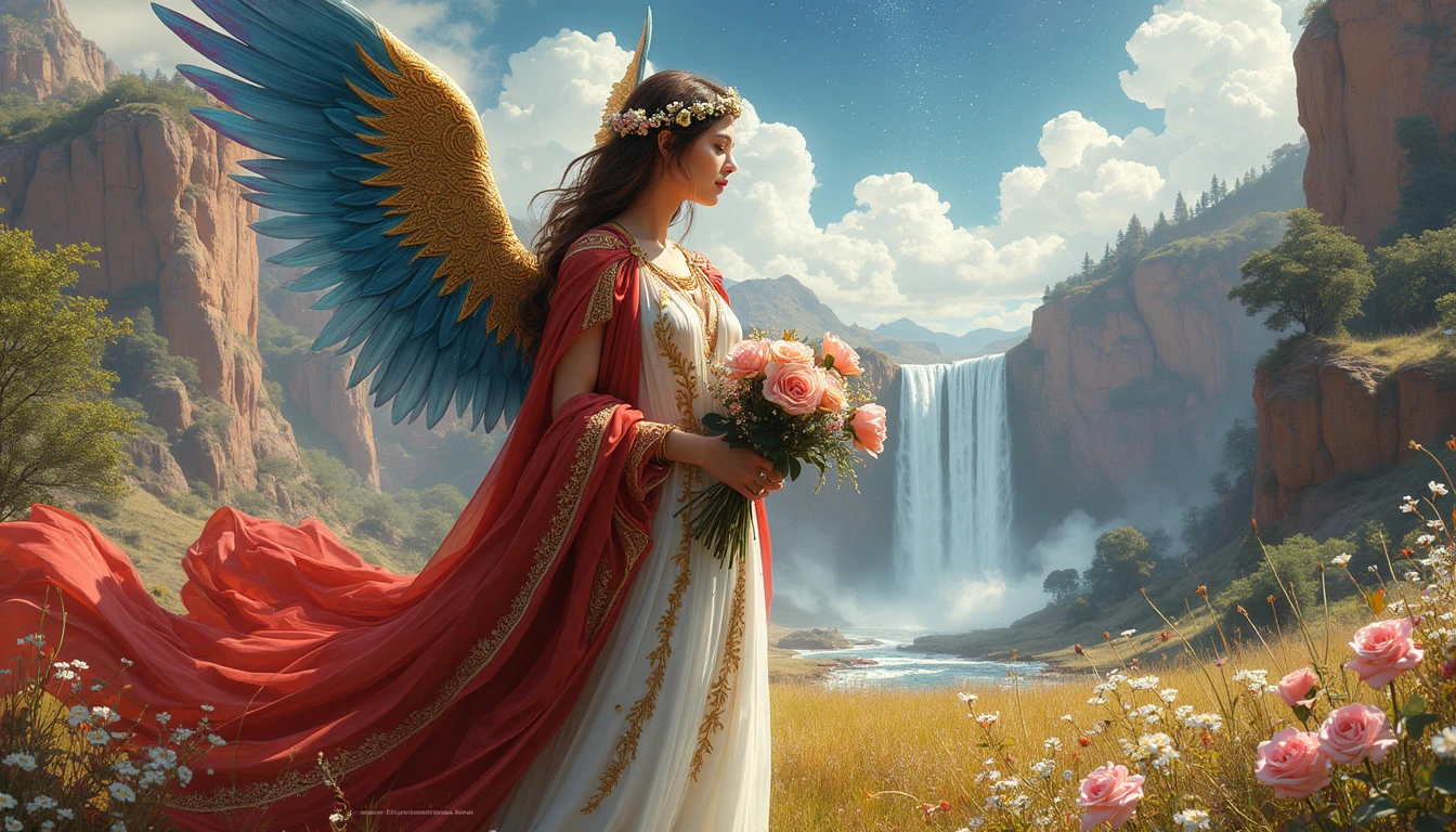 The colourful vivid image depicts a regal woman adorned in elaborate Roman-inspired attire, featuring flowing drapery made of rich, shimmering fabrics in deep reds and golds. Her gown is intricately embroidered with mythical motifs, reflecting the grandeur of the Roman Empire fused with fantasy elements. She possesses magnificent wings that extend gracefully from her back, resembling those of a majestic bird, with iridescent feathers that catch the light, showcasing a spectrum of colors. Surrounding her is an ethereal landscape, She stands amidst a stunning plateau, surrounded by towering mountains. Her luscious brunette locks cascade down her back as she gazes out at the distance, her large blue and golden wings spread above her shoulders. A delicate flower wreath adorns her hair. She holds a bouquet of pink and white roses, her long white dress with golden embroidery shimmering in the soft light. The lush landscape behind her features a sweet grass field with colorful blooms, majestic trees and a majestic waterfall cascading down a cliff with dense vegetation. The star-studded magenta-blue sky above adds to the peaceful ambiance, as if time has stood still.