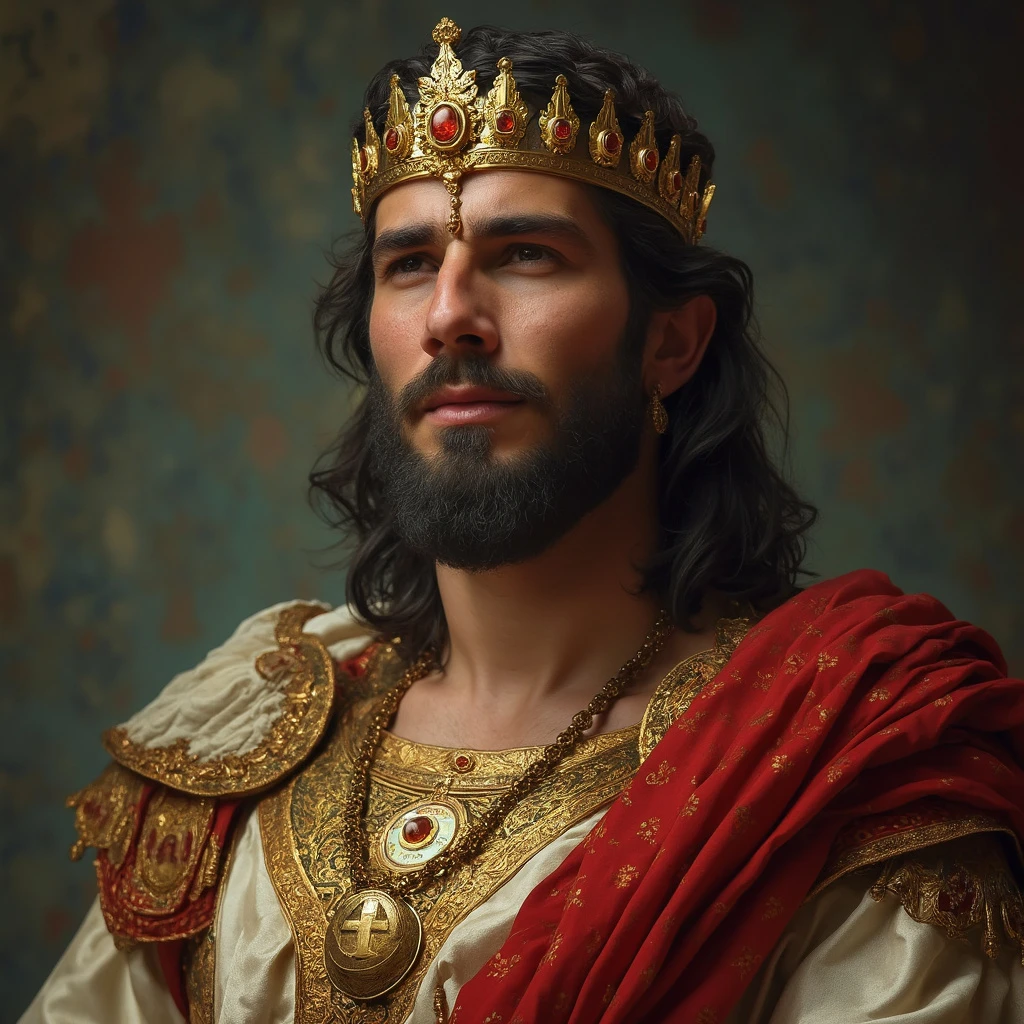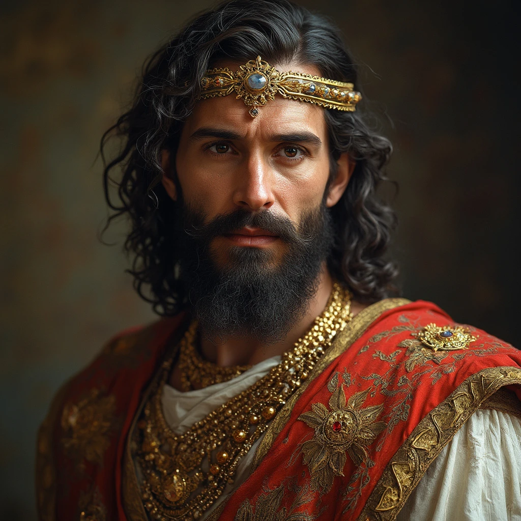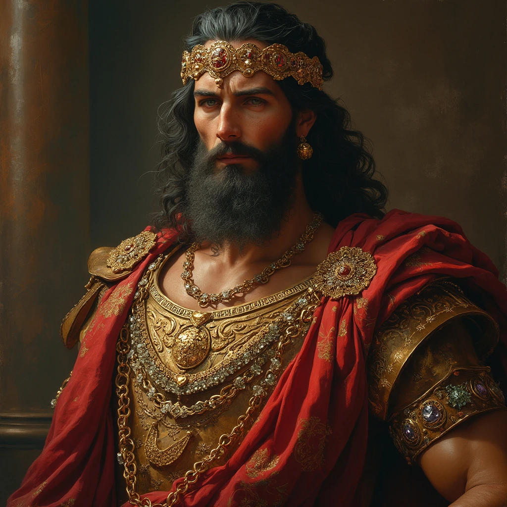 A hyper-realistic portrait of the Persian King Xerxes richly decorated, and with rich clothes and jewellery