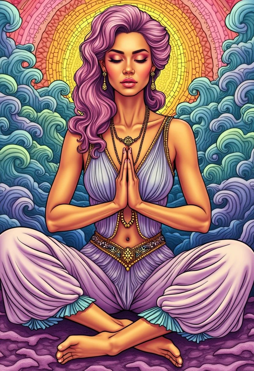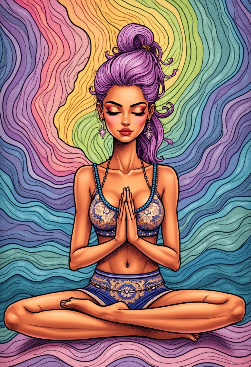 An intricate portrait in the style of Zentangle. A woman with slightly orange tinted tan skin. She is sitting with her legs folded Indian style. Her hair is pulled into a pompadour ponytail. Her hair is a mix of pastel pink and lilac. Her hands are pressed together in front of her in prayer. Behind her is a mix of rainbow pastel waves, psychedelia. She is dressed as a vintage Genie in sheer silks. rainbow moiré patterns, trance-inducing.