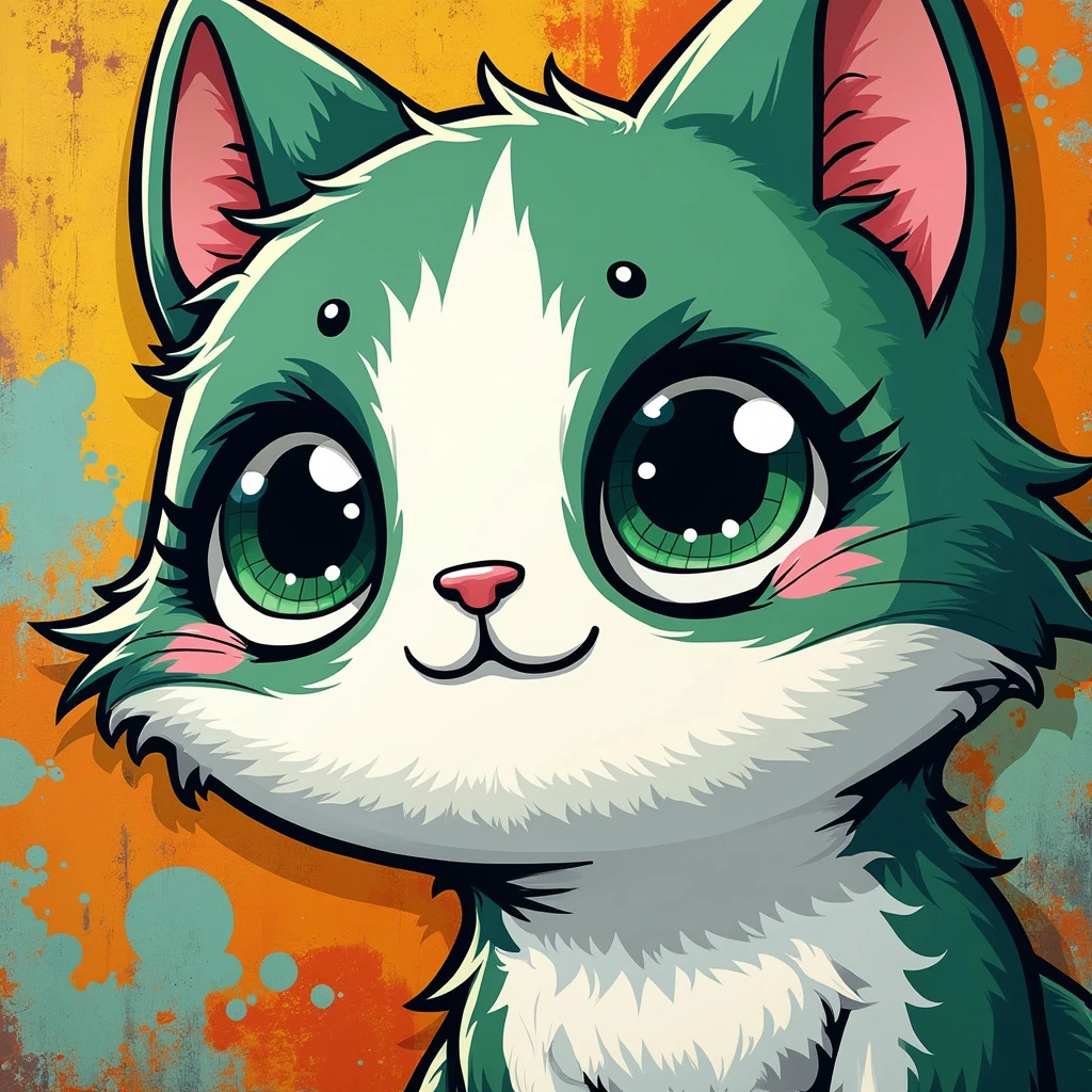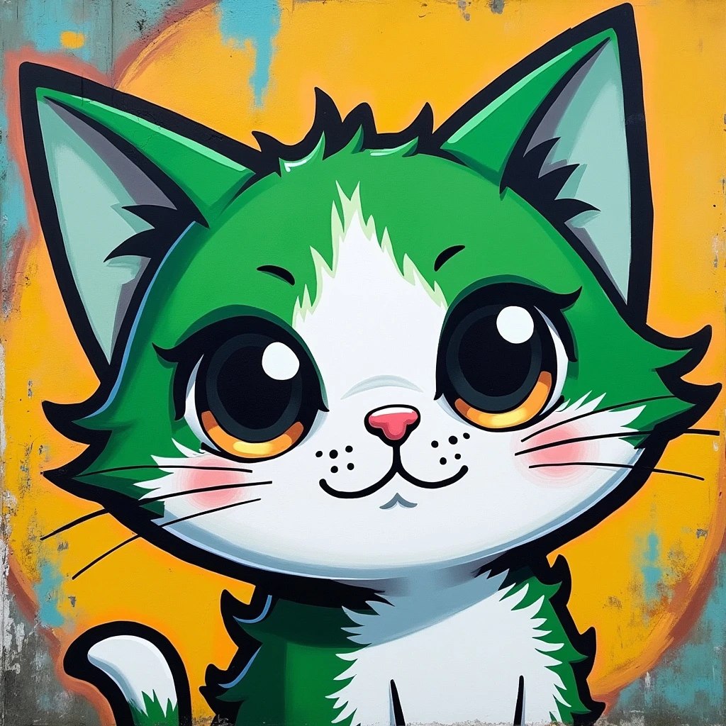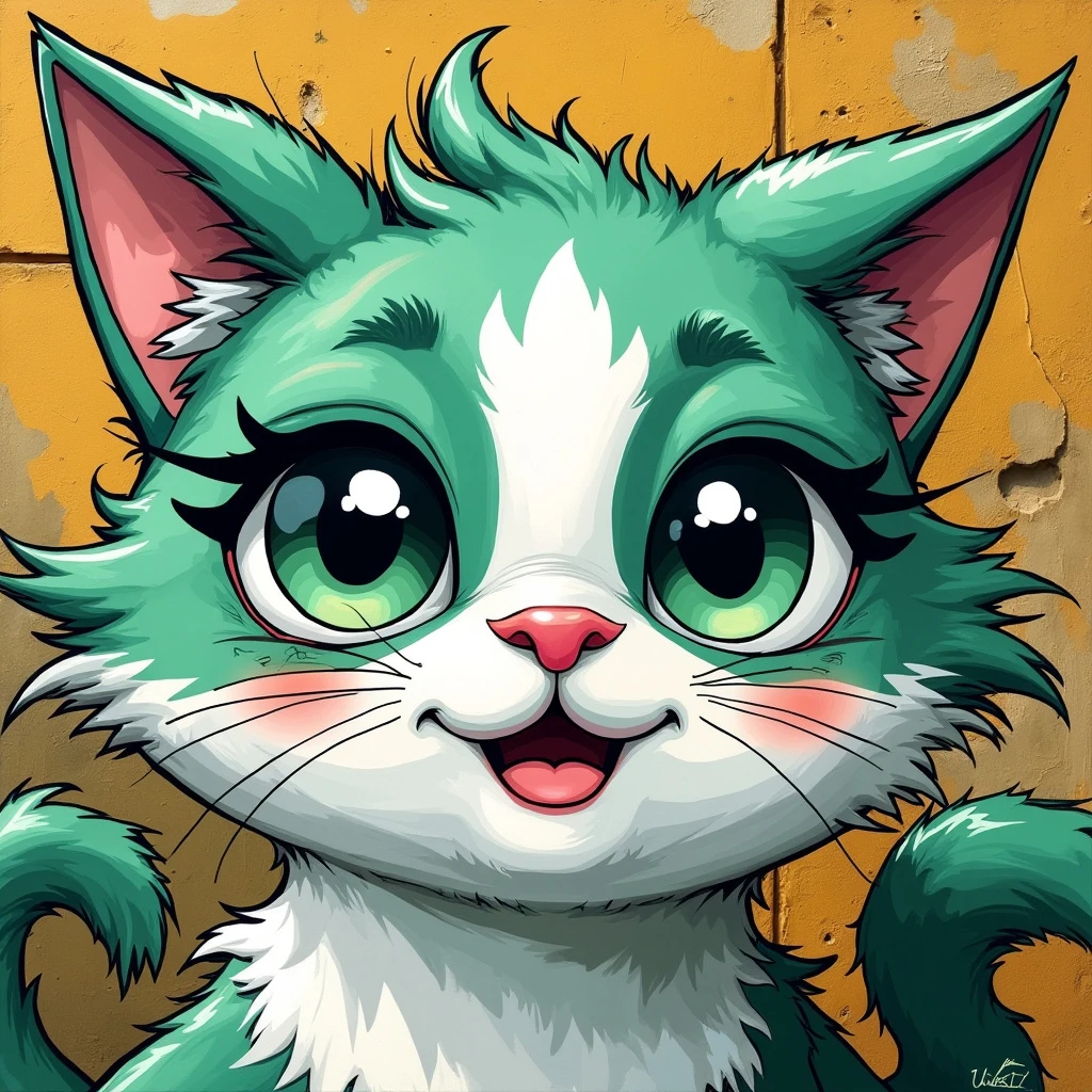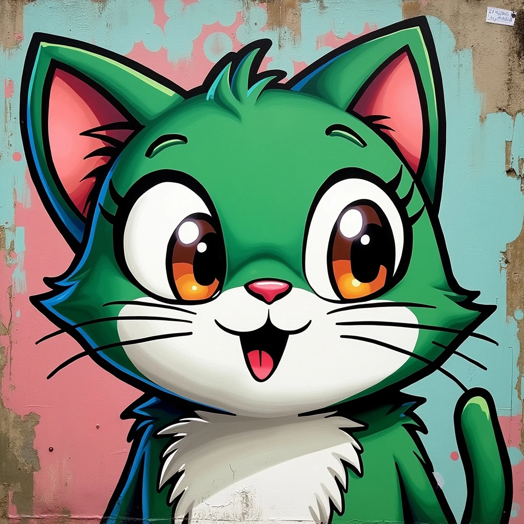 Cartoon cat, with white and green fur, graffiti art in the style of Goro Fujita and Tomokazu Matsuyama, inspired by crisp neo-pop illustrations, close-up of cartoon face with big eyes, cartoon cat has a happy expression, in a graffiti style.