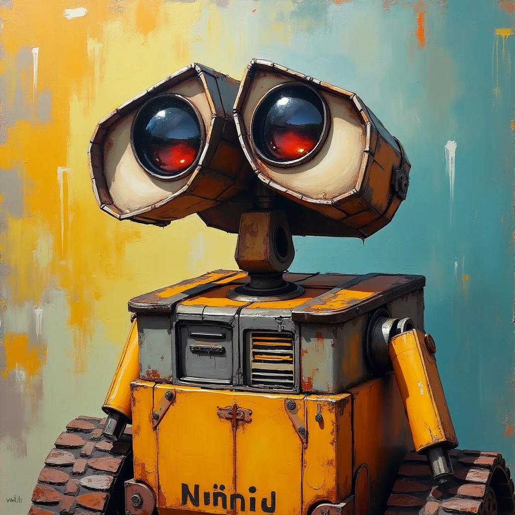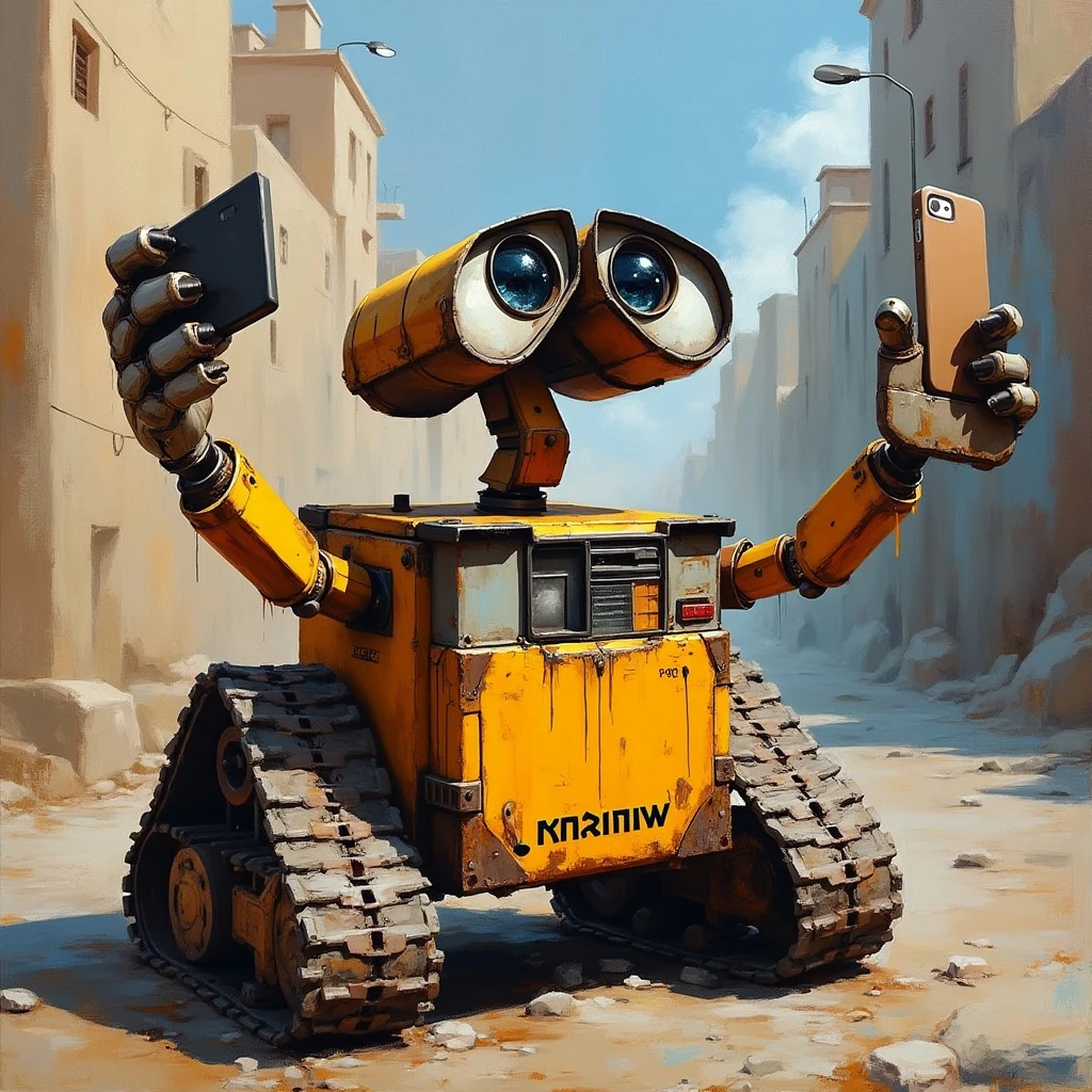 cute wall-E Pixar robot in fashion style looking to camera , get selfie ,which he has been very proud of, and this is evident in his face. oil painting by Yossi Kotler. oil on canvas impasto Pino Daeni Yossi Kotler , Fainting laughter comically