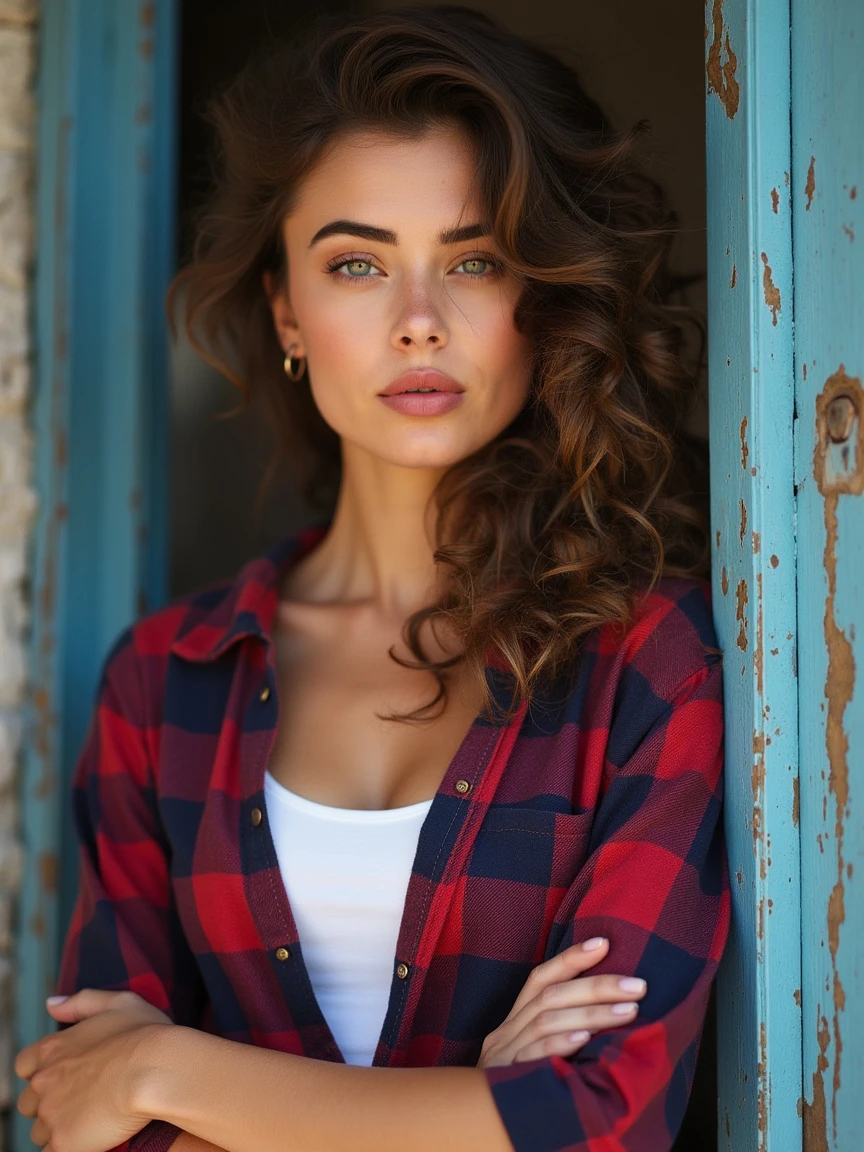 An image of a woman with fair skin and natural, wavy hair styled in soft curls around her face. She has defined eyebrows and light-colored eyes that draw attention. She's dressed in a red and navy plaid shirt with the top unbuttoned to show a white undershirt, and the sleeves rolled up to the forearms. The woman is casually leaning against a weathered blue door frame with peeling paint, adding a rustic charm to the scene. Her arms are crossed or resting in front of her, and she has a soft, contemplative expression on her face.
