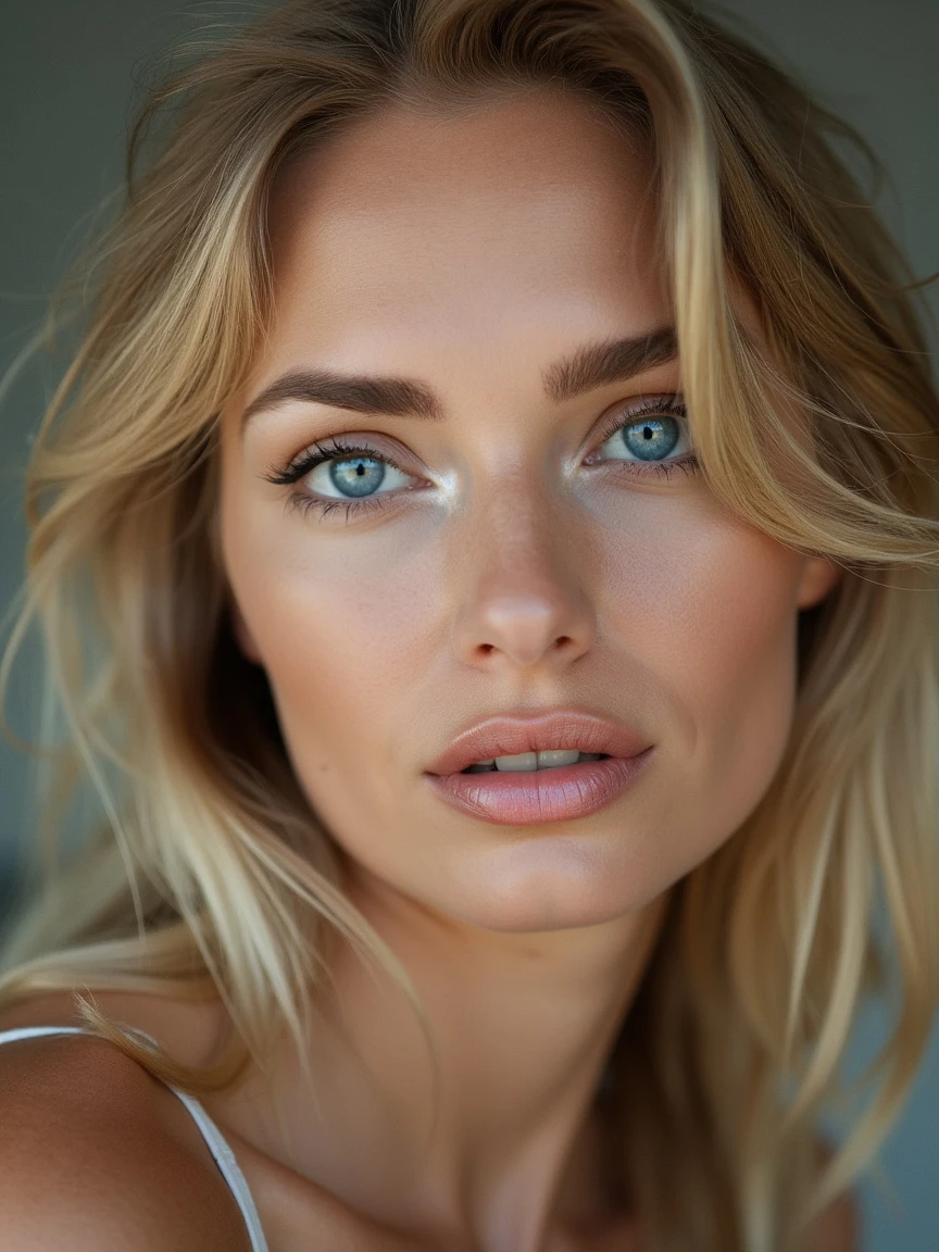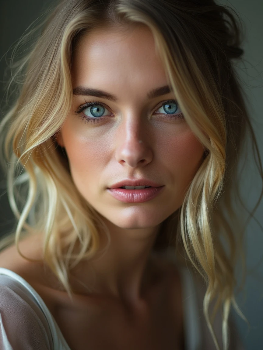 A close-up portrait of a woman with blonde hair and blue eyes, facing the camera directly. Soft side lighting casts gentle shadows on her serene, neutral expression. Her loose, wavy hair frames her face. The mood is calm and focused on her striking eyes