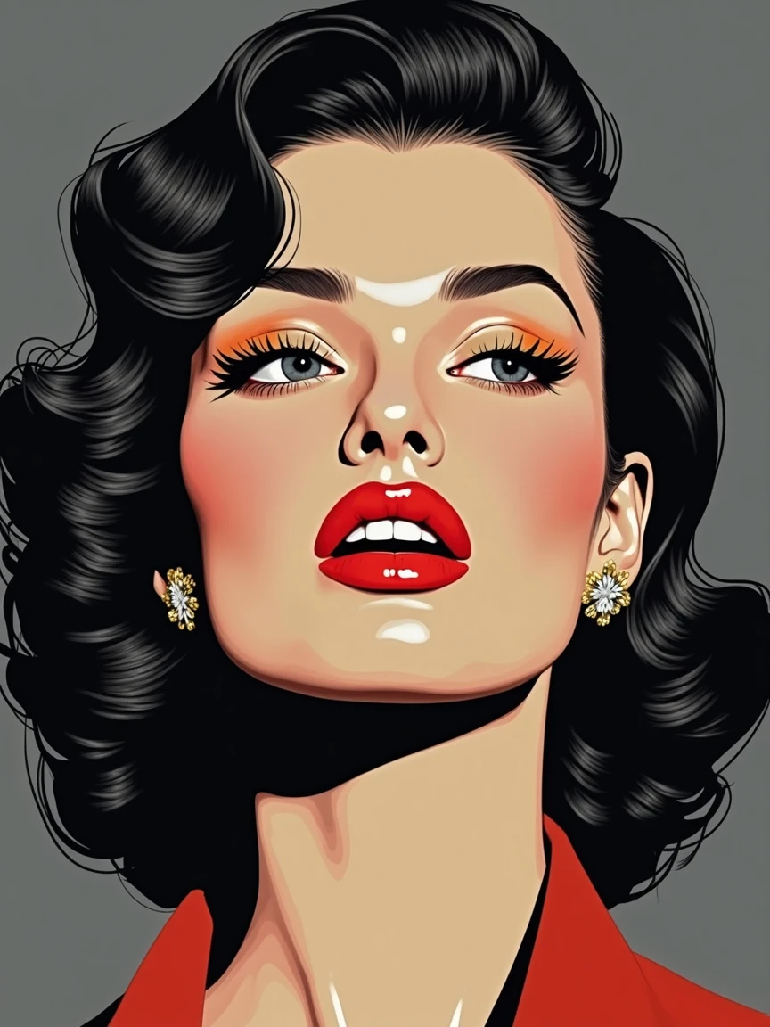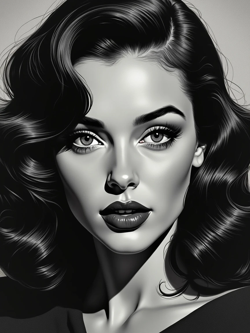 a woman's face in pop art style illustration, in the style of glamorous hollywood portraits, dark gray and light black, mort künstler, rollerwave, charming character illustrations, large format film, painted illustrations