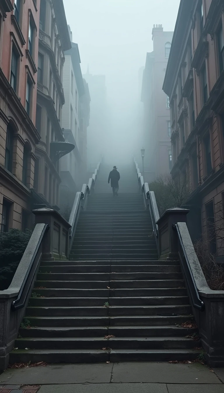 "A gray, misty day in a decaying metropolis, with a long staircase stretching upwards, flanked by iconic old brownstone buildings that seem to fade into the fog, their worn facades and crumbling details a testament to the city's neglect. The camera, positioned at the base of the staircase, looks up, capturing the symmetrical composition of the stairs and buildings, with a sense of melancholy and abandonment. The fog, swirling around the midpoint of the staircase, adds a sense of mystery and desolation to the scene. A lone figure, small in the distance, climbs the stairs, adding a sense of resilience and determination to the otherwise bleak urban landscape. The camera's lens is set to 24mm, with a small aperture (f/11) to ensure a deep depth of field, keeping the entire staircase and buildings in sharp focus. The shutter speed is set to 1/125s to capture the misty atmosphere and the subtle movement of the figure in the distance. The image is rendered in a muted color palette, with a cool tone to evoke the sense of decay and neglect, with the fog and worn buildings creating a haunting atmosphere."