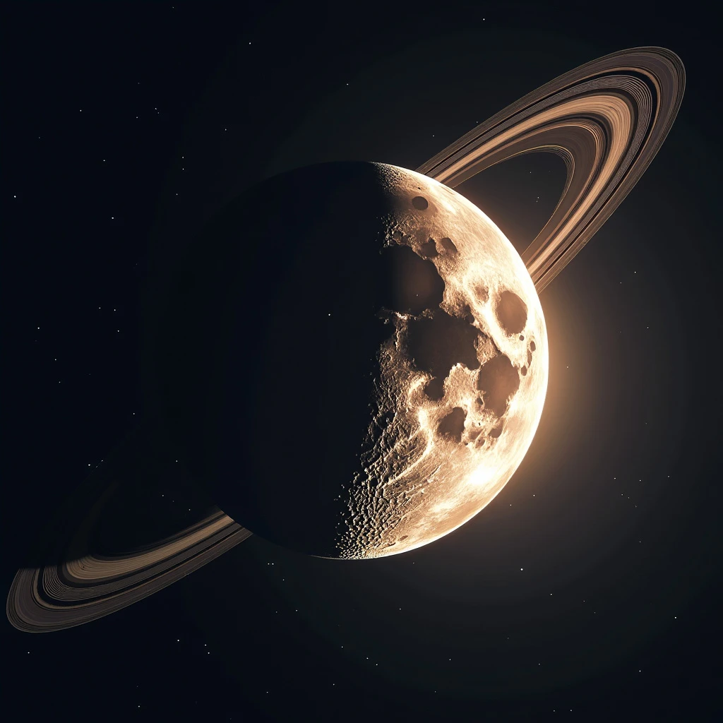 "A majestic, high-magnification photograph taken with a powerful 3000mm telephoto lens, capturing a stunning juxtaposition of celestial bodies. The Moon, a glowing crescent, fills the frame, its rugged terrain and craters visible in exquisite detail. Just behind the Moon, the planet Saturn is tiny, tiny visible, its rings a tiny but distinct presence. The camera's long focal length compresses the distance between the two celestial bodies, creating a dramatic and rare alignment. The image is rendered in a high-contrast, high-resolution format, with a wide dynamic range to capture the subtle details of the Moon's surface and Saturn's rings. The camera's shutter speed is set to 1/1000s to freeze the motion of the celestial bodies, and the aperture is set to f/8 to ensure a deep depth of field, keeping both the Moon and Saturn in sharp focus."