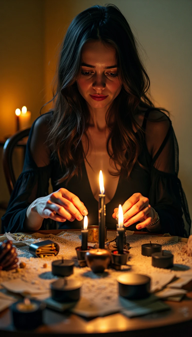 Subject: Amélia's room with a makeshift altar in the center. Composition: Medium shot, focusing on the altar and its components. The camera angle is slightly elevated (10 degrees above horizontal), providing a clear view of the objects on the altar. Visual Details: The room is dimly lit, with the primary light source being the flickering candles on the altar. The candles are black (#000000) with a realistic wax drip (#8B0000) and a flickering flame (#FFD700). The altar is composed of a variety of objects: black candles, matchboxes, coarse salt (#FFFFFF), and yellowed paper (#FFFFE0). The walls of the room are painted a muted yellow (#FAFAD2), reflecting the soft light of the candles. The overall mood is unsettling and suspenseful, reflecting the ritualistic nature of the scene. Lighting: 7:15 PM, the room is dimly lit by the flickering candlelight, casting long, dancing shadows on the walls. Action and Emotion: Amélia is shown carefully arranging the objects on the altar, her fingers trembling slightly. Her expression is a mixture of apprehension and fascination. Jake and Lúcia watch from a short distance, their expressions reflecting a mix of curiosity and unease. Character Details: Amélia: Her oval face (approximately 7 inches long, 5 inches wide), with high cheekbones (approximately 1.5 inches high) and a delicate jawline (approximately 4 inches long), is framed by her dark brown hair. Her large, almond-shaped hazel eyes (approximately 1.2 inches wide, 0.8 inches tall), with flecks of gold, are slightly wide-set (approximately 1.5 inches between outer corners) and convey a mixture of apprehension and fascination. Her full lips (approximately 1.8 inches wide, 0.5 inches full) are slightly parted, revealing a hint of nervousness. Her smooth, pale skin with a slight peach undertone is illuminated by the flickering candlelight. Her fingers tremble slightly as she arranges the objects on the altar. Jake: His square face (approximately 6 inches long, 5 inches wide), with a strong jawline (approximately 5 inches long) and prominent chin (approximately 1.2 inches wide), is framed by his short, dark brown hair styled with gel. His slightly hooded, dark brown eyes (approximately 1.1 inches wide, 0.7 inches tall), with a hint of amber, convey a mix of curiosity and amusement. His thin lips (approximately 1.7 inches wide, 0.3 inches full) curve into a subtle smirk. His olive skin with a slightly tanned complexion is illuminated by the flickering candlelight. His posture is relaxed, but his eyes are narrowed, hinting at a mischievous glint. Lúcia: Her face (approximately 6.5 inches long, 5 inches wide), which is framed by dark brown hair, has a gentle expression, her large, almond-shaped eyes (approximately 1 inch wide, 0.6 inches tall), which are a warm brown, reflect a mix of curiosity and unease. Her full lips (approximately 1.5 inches wide, 0.4 inches full) are slightly pursed. Her smooth, pale skin with a slight peach undertone is illuminated by the flickering candlelight. Her body is slightly leaning forward, reflecting her fascination with the ritual. Environmental Details: The room is a typical college dorm room. A desk with a computer is visible in the background. The room is cluttered with books and other personal items in shades of muted blues (#4169E1) and grays (#A9A9A9). Object Descriptions: Candles: Black wax candles with a flickering flame. Matchboxes: Standard matchboxes with a red and white design. Coarse Salt: A small pile of coarse salt, reflecting the candlelight. Yellowed Paper: A few sheets of yellowed paper with illegible writing, placed on the altar. fantasy illustration, concept art, detailed, painterly, vibrant, artstation