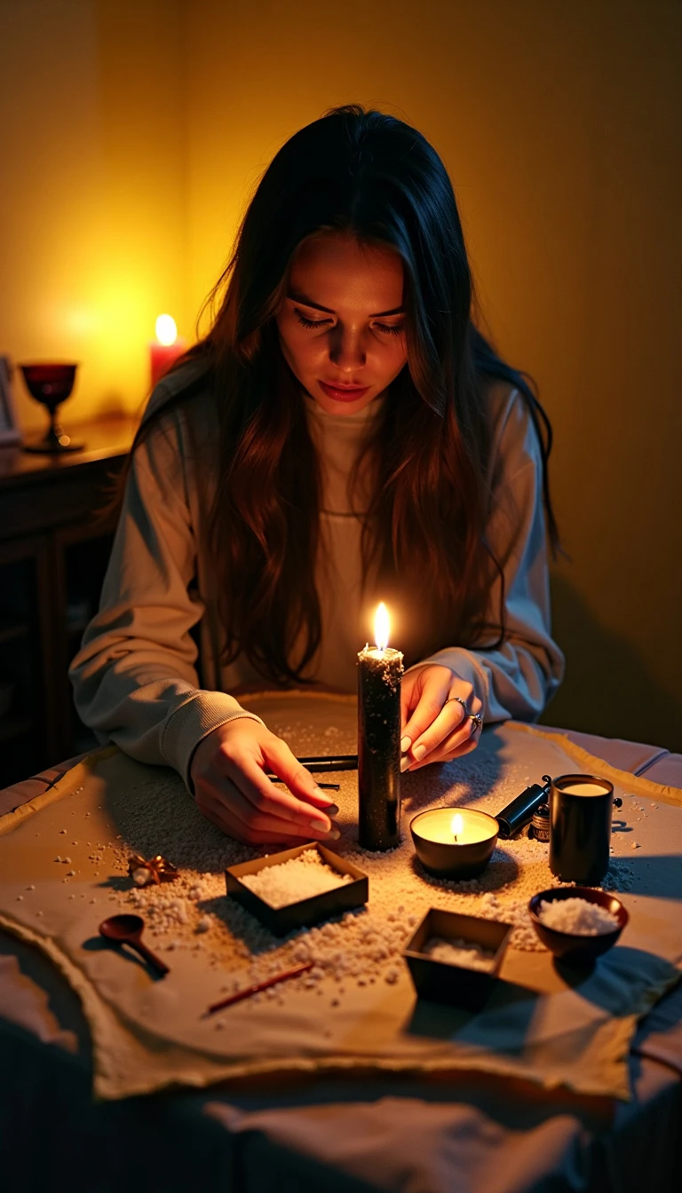Subject: Amélia's room with a makeshift altar in the center. Composition: Medium shot, focusing on the altar and its components. The camera angle is slightly elevated (10 degrees above horizontal), providing a clear view of the objects on the altar. Visual Details: The room is dimly lit, with the primary light source being the flickering candles on the altar. The candles are black (#000000) with a realistic wax drip (#8B0000) and a flickering flame (#FFD700). The altar is composed of a variety of objects: black candles, matchboxes, coarse salt (#FFFFFF), and yellowed paper (#FFFFE0). The walls of the room are painted a muted yellow (#FAFAD2), reflecting the soft light of the candles. The overall mood is unsettling and suspenseful, reflecting the ritualistic nature of the scene. Lighting: 7:15 PM, the room is dimly lit by the flickering candlelight, casting long, dancing shadows on the walls. Action and Emotion: Amélia is shown carefully arranging the objects on the altar, her fingers trembling slightly. Her expression is a mixture of apprehension and fascination. Jake and Lúcia watch from a short distance, their expressions reflecting a mix of curiosity and unease. Character Details: Amélia: Her oval face (approximately 7 inches long, 5 inches wide), with high cheekbones (approximately 1.5 inches high) and a delicate jawline (approximately 4 inches long), is framed by her dark brown hair. Her large, almond-shaped hazel eyes (approximately 1.2 inches wide, 0.8 inches tall), with flecks of gold, are slightly wide-set (approximately 1.5 inches between outer corners) and convey a mixture of apprehension and fascination. Her full lips (approximately 1.8 inches wide, 0.5 inches full) are slightly parted, revealing a hint of nervousness. Her smooth, pale skin with a slight peach undertone is illuminated by the flickering candlelight. Her fingers tremble slightly as she arranges the objects on the altar. Jake: His square face (approximately 6 inches long, 5 inches wide), with a strong jawline (approximately 5 inches long) and prominent chin (approximately 1.2 inches wide), is framed by his short, dark brown hair styled with gel. His slightly hooded, dark brown eyes (approximately 1.1 inches wide, 0.7 inches tall), with a hint of amber, convey a mix of curiosity and amusement. His thin lips (approximately 1.7 inches wide, 0.3 inches full) curve into a subtle smirk. His olive skin with a slightly tanned complexion is illuminated by the flickering candlelight. His posture is relaxed, but his eyes are narrowed, hinting at a mischievous glint. Lúcia: Her face (approximately 6.5 inches long, 5 inches wide), which is framed by dark brown hair, has a gentle expression, her large, almond-shaped eyes (approximately 1 inch wide, 0.6 inches tall), which are a warm brown, reflect a mix of curiosity and unease. Her full lips (approximately 1.5 inches wide, 0.4 inches full) are slightly pursed. Her smooth, pale skin with a slight peach undertone is illuminated by the flickering candlelight. Her body is slightly leaning forward, reflecting her fascination with the ritual. Environmental Details: The room is a typical college dorm room. A desk with a computer is visible in the background. The room is cluttered with books and other personal items in shades of muted blues (#4169E1) and grays (#A9A9A9). Object Descriptions: Candles: Black wax candles with a flickering flame. Matchboxes: Standard matchboxes with a red and white design. Coarse Salt: A small pile of coarse salt, reflecting the candlelight. Yellowed Paper: A few sheets of yellowed paper with illegible writing, placed on the altar. fantasy illustration, concept art, detailed, painterly, vibrant, artstation